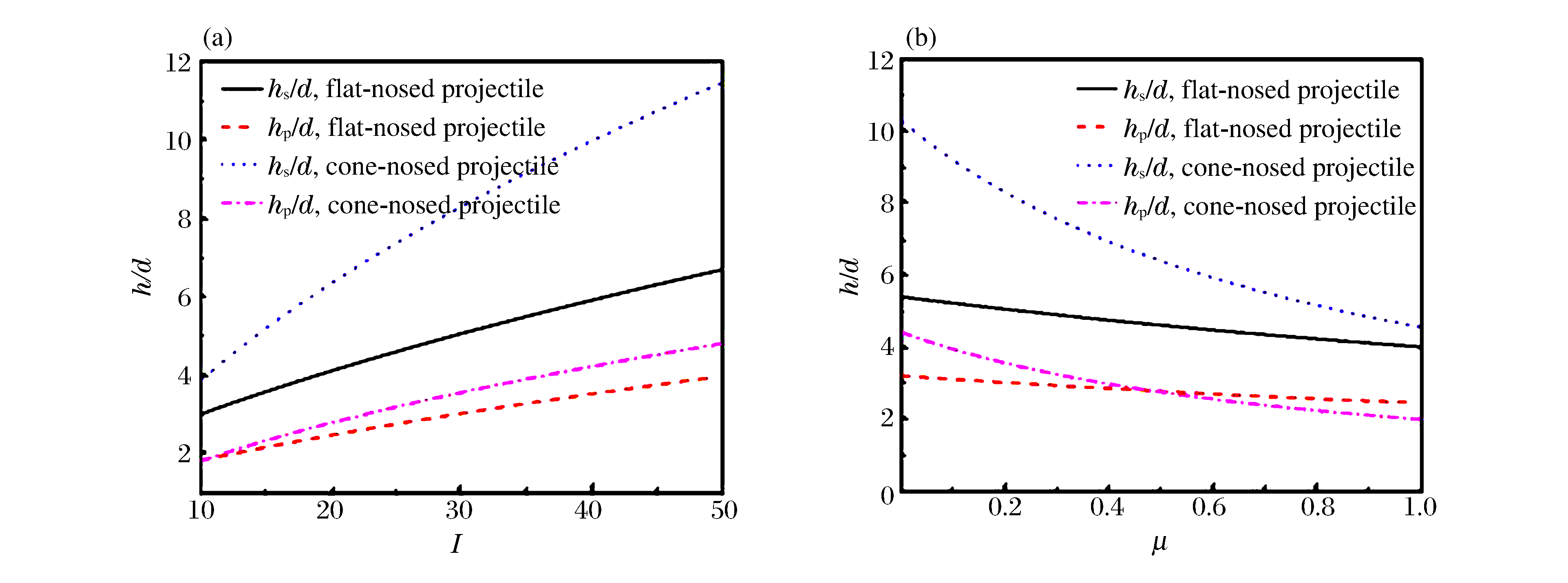 实验 L/2a fc /MPa ft/MPa τs/MPa IBL vBL/(m·s-1) 实验 本文计算 T-1 2 25.0 2.6 4.0 10.5 27.0~35.7 47 T-2 2 25.2 3.1 4.4 10.5 41.7~56.8 49 T-3 2 161.9 7.3 17.2 10.5 34.7~58.5 97 T-4 2 175.3 13.8 24.6 10.5 76.0~104.0 116 表 2 本文计算结果与普通混凝土实验[11]的比较