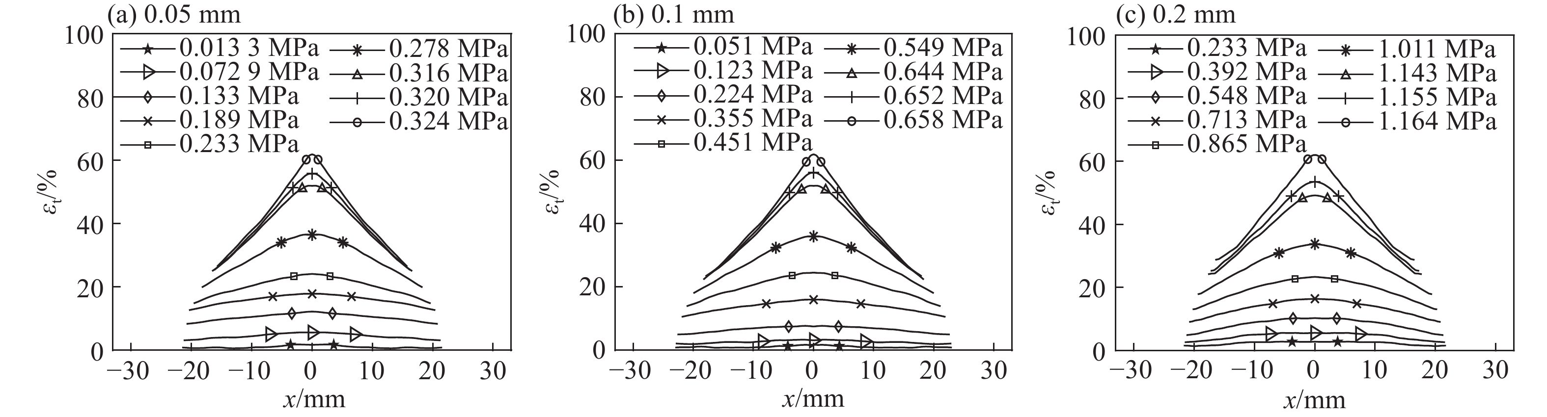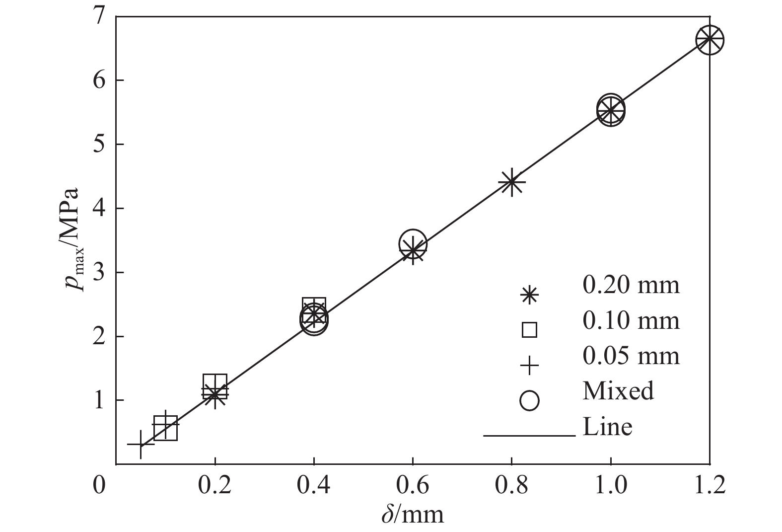 膜片使用数量 总厚度/mm 最大破坏压力/MPa 膜片使用数量 总厚度/mm 最大破坏压力/MPa 0.05 mm 0.1 mm 0.2 mm 0.05 mm 0.1 mm 0.2 mm 1 0 0 0.05 0.311 4 2 1 0.6 3.446 2 0 0 0.1 0.626 0 0 3 0.6 3.344 0 1 0 0.1 0.566 0 0 4 0.8 4.411 4 0 0 0.2 1.181 4 0 4 1 5.568 0 2 0 0.2 1.214 0 2 4 1 5.514 0 0 1 0.2 1.089 0 0 5 1 5.524 4 0 1 0.4 2.244 4 2 4 1.2 6.632 0 2 1 0.4 2.292 0 0 6 1.2 6.659 0 4 0 0.4 2.417 表 2 三种不同厚度膜片临界点的数据