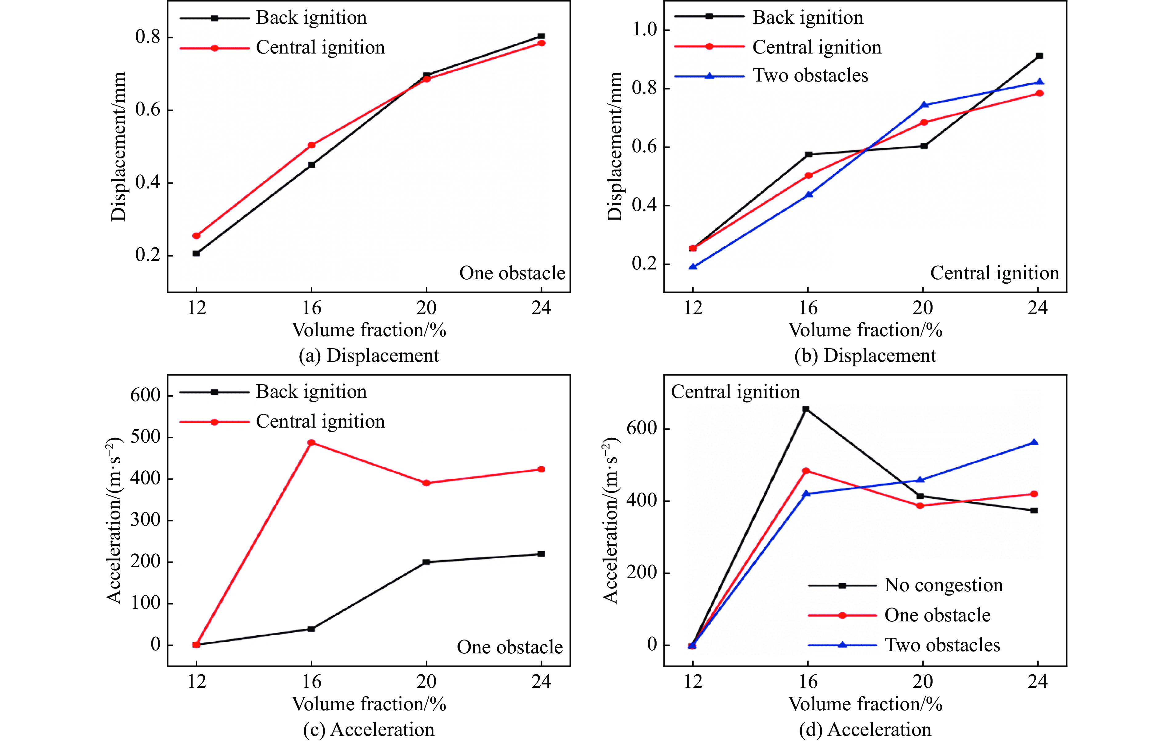 摘要: 氢能因具有环保高效等优点,被公认为21世纪最具发展前景的清洁能源,缺点是在使用过程中极易发生爆炸事故。泄爆作为爆炸防护的重要手段,可以有效提高结构在爆炸过程中的安全性和可靠性。为获得结构在氢气泄爆作用下的动力响应特性,本文从实验和数值模拟两个方面展开研究。在12 m×2.5 m×2.5 m的大尺度ISO标准容器中开展了一系列氢气泄爆实验,主要考虑氢气体积分数、点火位置、障碍物布置等参数的影响,并对结构内部超压荷载特征和动力响应演化规律进行了分析。结果表明,结构位移由首个超压峰值主导,并在该阶段与方舱内超压趋势保持一致,且两者峰值之间保持线性关系;加速度则由不稳定燃烧引起的超压高频振荡主导。在实验范围内,位移峰值受氢气体积分数影响显著,且随着氢气体积分数增大而增大。加速度峰值则还受到点火位置的影响,中心点火的情景要大于后端点火的情景。障碍物数量对结构动力响应的影响并非单调关系。此外,基于现场环境振动测试结果,建立了该结构的基准有限元模型。数值模拟及实验结果吻合良好,因此该基准有限元模型可进一步用于不同工况下氢气泄爆荷载作用下结构动力响应的预测和分析。Abstract: Hydrogen is recognized as one of the most promising energies in the 21st century due to the nature of no pollution and high efficiency, unfortunately, it is likely to suffer from explosion in the process of usage. As one of the important ways of disaster, venting can effectively improve the safety and reliability of the structure under hydrogen explosion. In order to study the dynamical characteristics of the structure under vented hydrogen explosion, experimental and numerical studies were conducted in this paper. On the one hand, a number of scenarios were carried out for vented hydrogen explosion in a large-scale ISO container of 12 m×2.5 m×2.5 m to investigate the effects of hydrogen volume fraction, the position of ignition as well as the arrangement of obstacles on the structural dynamics. The characteristics of internal overpressure load and the evolution mechanism of dynamic response were analyzed. Results indicate that the structural displacements are dominated by the first overpressure peak. The trend of displacement agrees well with that of the overpressure, and there is a linear relationship between their peaks. The acceleration is dominated by high-frequency oscillations of the overpressure caused by unstable combustion. Furthermore, the peak of the displacement is significantly affected by hydrogen volume fraction and increases with the increase of hydrogen volume fraction. The peak acceleration is also affected by the ignition position, and the peak acceleration of central ignition is larger than that of back ignition. Additionally, the effects of the number of obstacles on structural dynamic response are not monotonic. On the other hand, a baseline finite element model of the structure is established based on the ambient vibration testing. The numerical simulation results agree well with those of the experimental results. Therefore, the model can be used to predict structural dynamic responses under vented hydrogen explosion.