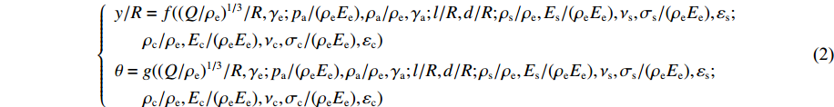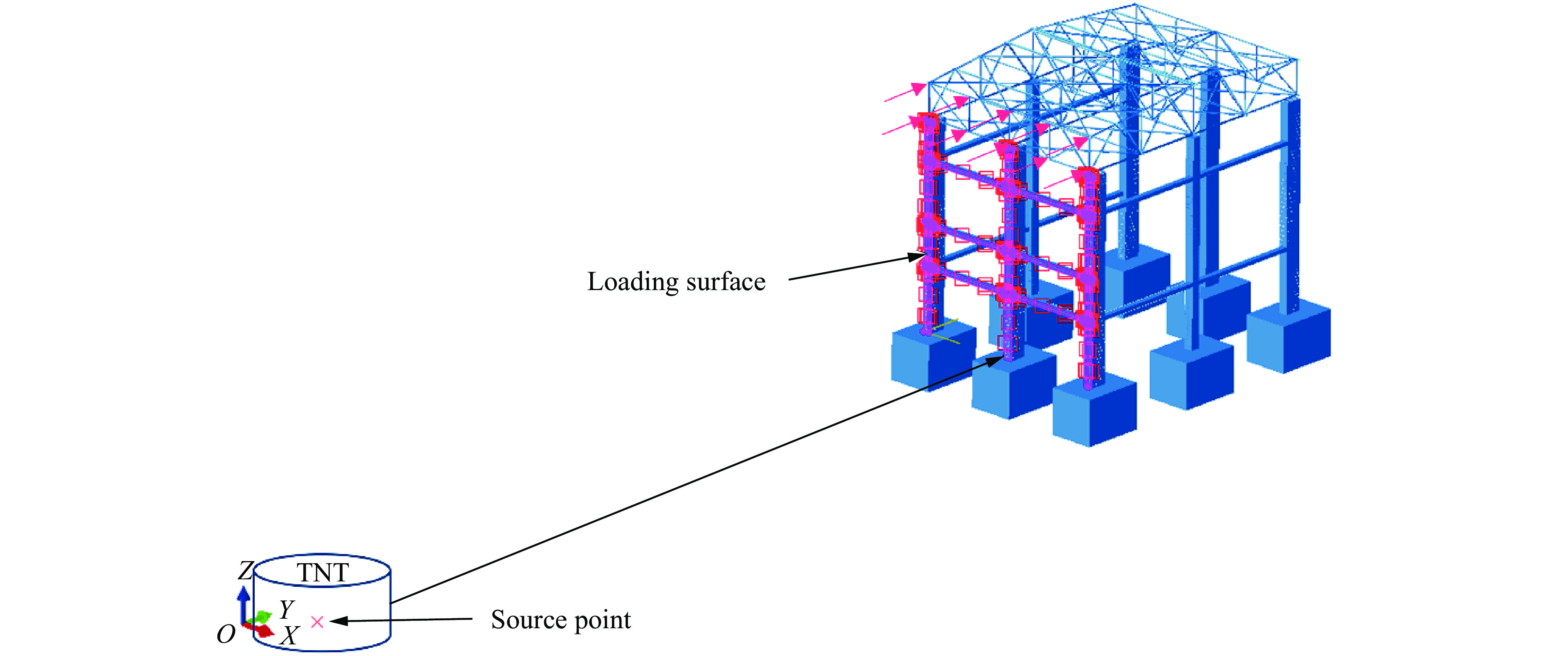 摘要: 为了研究钢筋混凝土排架结构在大当量爆炸冲击波下的破坏规律,依据最大TNT当量为3 t的爆炸试验,对排架主体结构的抗爆破坏等级进行数值模拟研究。通过量纲分析得到1/2缩比模型的荷载参数和结构尺寸。基于Abaqus有限元软件,利用CONWEP方法实现爆炸加载,分别计算装药0.5 t爆距33 m和装药3 t爆距33 m两种工况下排架结构的破坏形态,并与试验结果进行对比。进一步通过控制药量和距离,计算不同超压和冲量下缩比模型的破坏形态。研究结果表明,排架的关键破坏特征为中间承重柱的倾覆转动;数值计算与试验破坏形态吻合较好,特征位移和特征转角的最大相对误差分别为5.6%和4.6%。以承重柱的倾覆角作为划分依据,将计算结果分为3种破坏等级,拟合得到的超压-冲量曲线和药量-距离曲线可用于厂房安全距离和仓库容量设计以及意外爆炸下的破坏程度预估。Abstract: To study the failure law of reinforced concrete bent structures under large equivalent explosions, the damage grades of the bent structures against blast were numerically calculated based on the explosion test with the maximum equivalent of 3 t TNT. The load parameters and structural dimensions of the 1/2 scaled model were obtained through dimensional analysis. Based on the Abaqus finite element software, the CONWEP method was used to achieve the blast loading. The failure modes of the structures, under the explosion loads with TNT equivalent 0.5 t and blast distance 33 m as well as TNT equivalent 3 t and blast distance 33 m, were calculated, respectively, and compared with the test results. Further, the failure patterns of the scale model under different overpressures and impulses were calculated by controlling the TNT equivalent and blast distance. The research results show that the middle column of the bent structure is prone to damage in the form of overall overturning under a lateral blast load; the calculated failure morphologies are in good agreement with the experimental ones, and the maximum relative errors of the characteristic displacements and characteristic corners are 5.6% and 4.6%, respectively. The overturning angle of the load-bearing column was used as the basis for the damage-grade division, and the calculated results were divided into three damage levels. The fitted overpressure-impulse and equivalent-distance curves can be used in the design of safety distance and warehouse capacity and the estimation of the damage degree of accidental explosion.