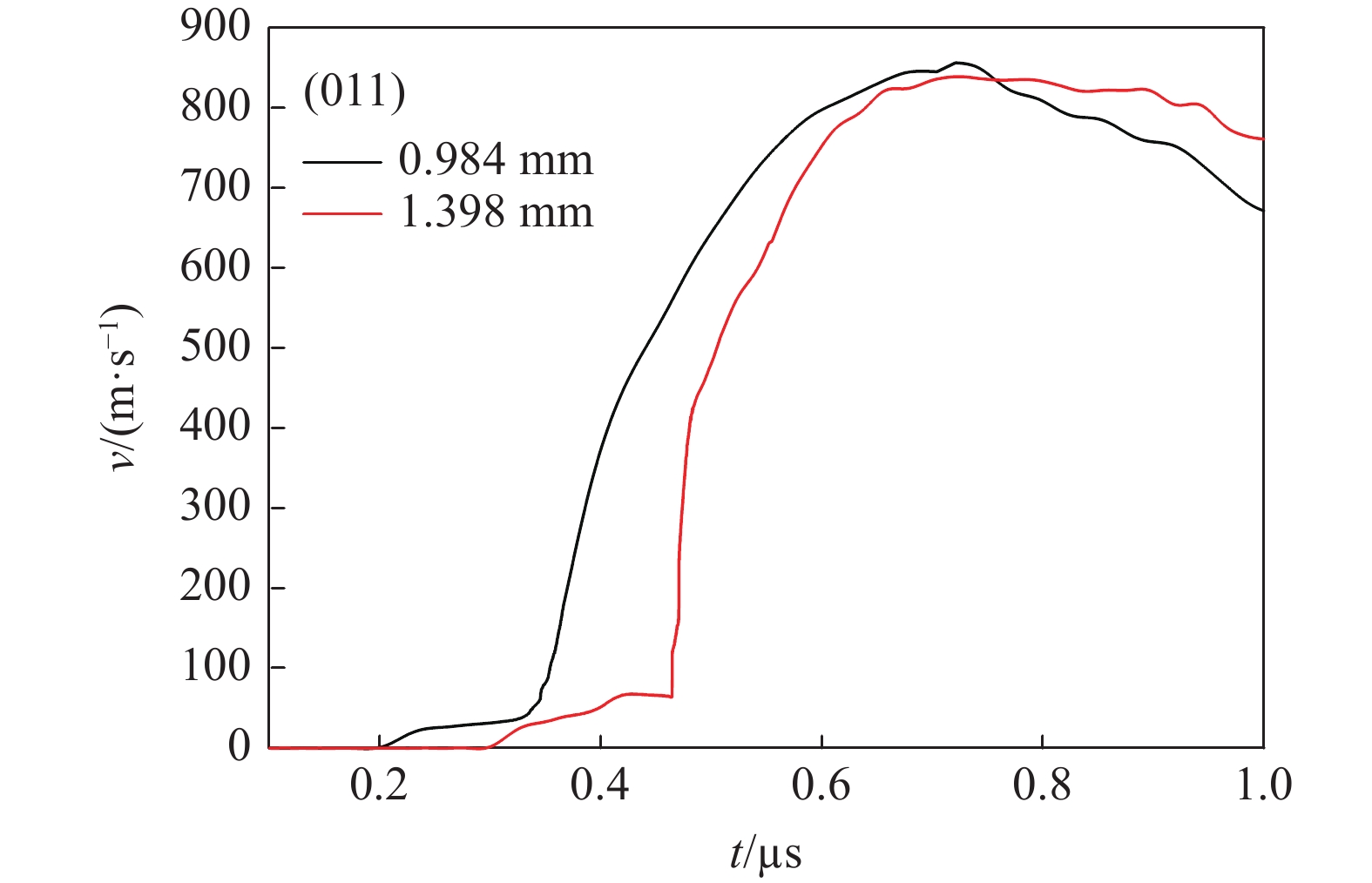 HMX晶向 厚度/mm 屈服速度/(m·s−1) 弹性极限 /GPa (011) 1.398 67.05 0.927 0.510 77.63 1.076 (010) 0.975 69.80 0.966 1.262 70.30 0.973 0.961 63.90 1.263 1.253 71.50 0.990 0.775 63.90 0.883 0.913 67.10 0.928 0.664 69.78 0.966 0.781 59.69 0.824 表 3 模拟计算所用的模型参数