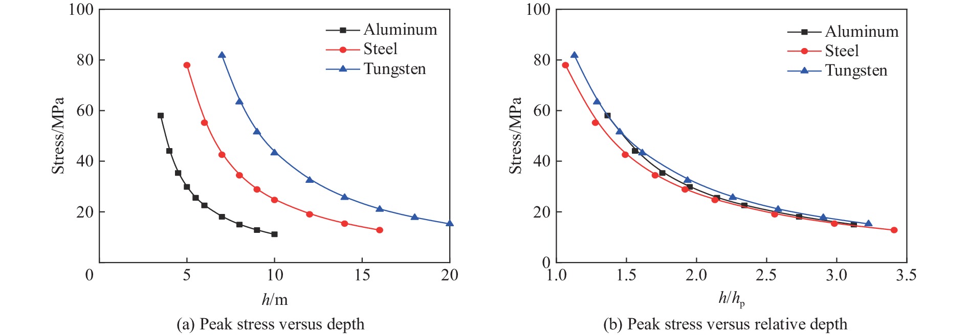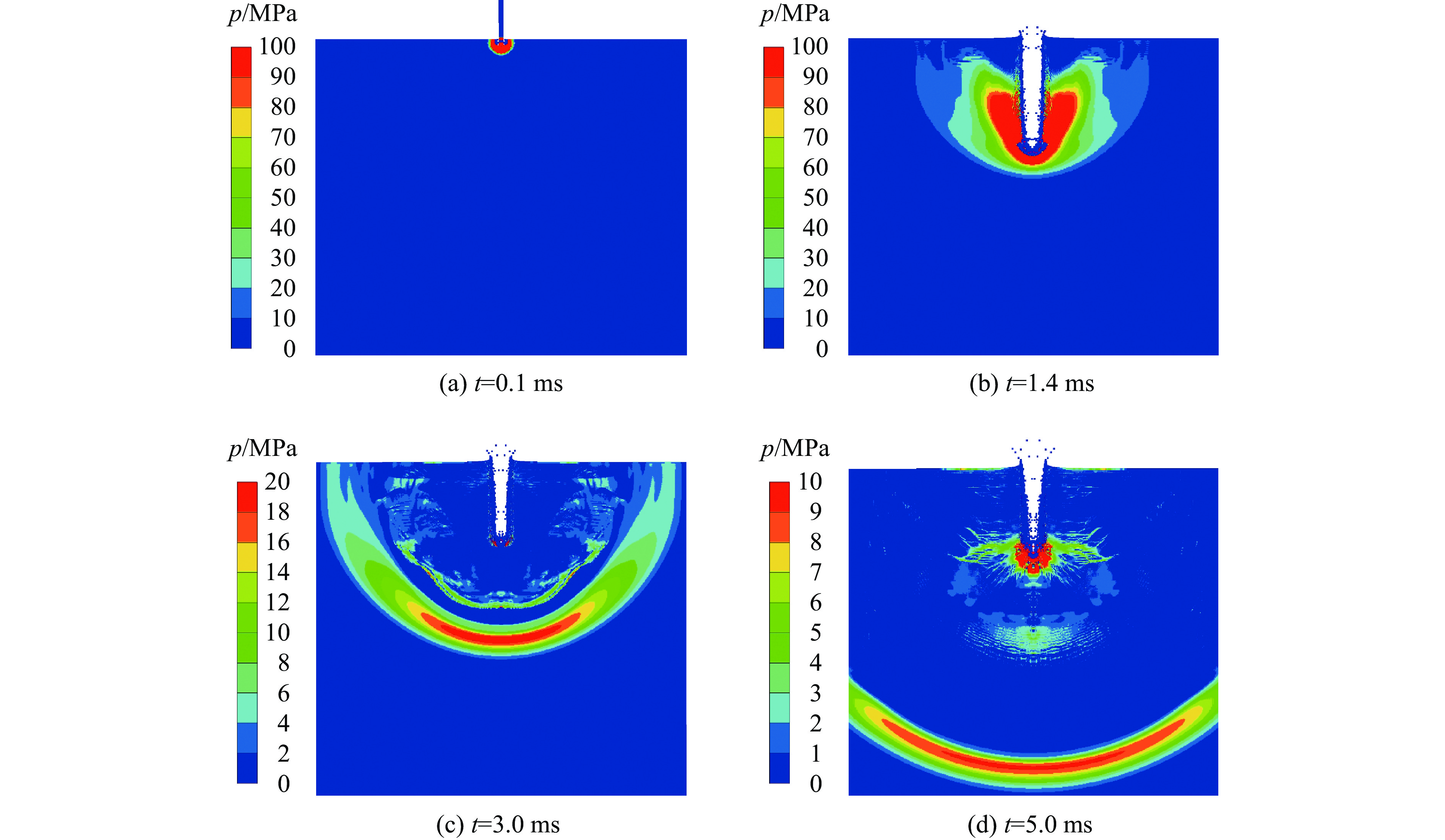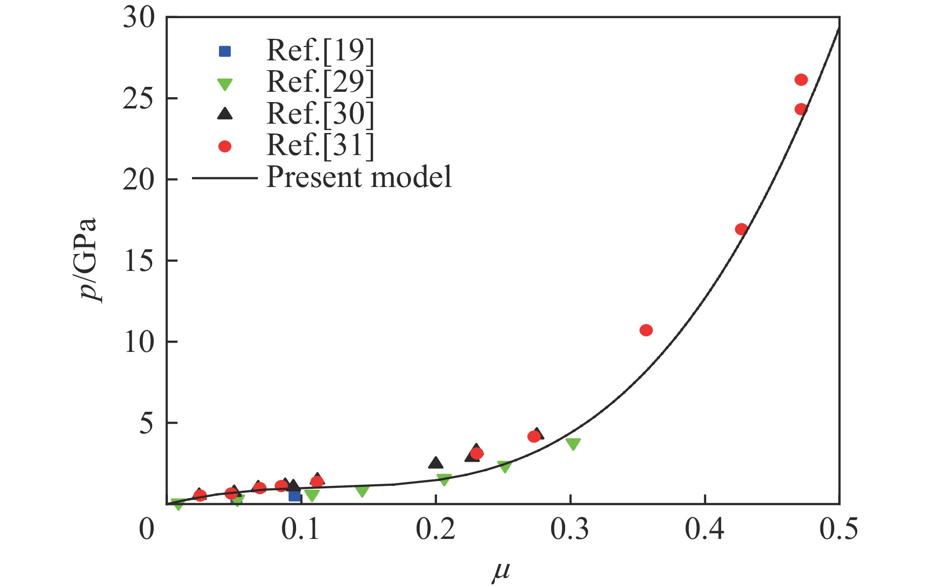 摘要: 为探究超高速动能武器的对地破坏效应及其影响因素,采用数值模拟方法对弹体超高速侵彻的地冲击规律进行了研究。首先,基于石灰岩静动态力学性能实验数据对材料模型参数进行了标定,并对已有弹体大范围着速侵彻石灰岩靶体进行了模拟,验证了所采用材料模型和数值模拟方法的合理性。随后,开展了钨合金长杆弹超高速侵彻石灰岩靶体的数值模拟,细致分析了地冲击传播的现象和机理:弹体超高速侵彻靶体时,弹靶交界面处会产生瞬时高压,并以应力波的形式在靶体中传播,对靶体内部造成破坏,且当弹体初速度高于3.0 km/s时,地冲击显著增强。最后,进一步研究了不同弹靶参数对地冲击的影响,发现从相对深度来看,弹体参数(弹体长径比、密度)对地冲击规律影响不大;而靶体特征特别是孔隙率对地冲击传播具有较大影响。Abstract: With the advancement of hypervelocity weapons such as the “Rods-from-God”, the damage and failure in targets induced by the hypervelocity penetrators have been a topic of current research, which is still not fully understood. To address this issue, numerical investigation was carried out on ground shock induced by hypervelocity penetration of projectiles into limestone targets. As the material model and corresponding parameters are crucial for the accurate numerical predictions, the parameters for the p-α equation of state and the Kong-Fang material model recently proposed to describe the limestone were firstly calibrated based on a large amount of dynamic tests. The smooth particle hydrodynamics (SPH) method was employed for simulating the target and the axisymmetric numerical model was used to improve the computational efficiency. The calibrated parameters and numerical algorithm were validated by numerically simulating a series of penetration tests on limestone targets with a broad range of striking velocities. Then, based on the validated numerical model, the penetration of long-rod tungsten projectile into a limestone target was simulated and the mechanism of the corresponding ground shock was discussed. It was found that a high pressure in the target was induced by the hypervelocity impact of the projectile, which then propagated into the target as a stress wave, leading to the damage and failure in the target. The induced ground shock wave increased with the increase of the initial projectile velocity, especially when the initial projectile velocity is over 3.0 km/s. Finally, parametric study was conducted to investigate the effects of the parameters related to the projectiles and targets on the ground shock wave. The parameters related to the projectiles, for example, the length-to-diameter ratio and density, which can influence on the damage area of the targets by influencing the depth of penetration, has limited influence on the ground shock wave from the view of the relative depth (the ratio of the depth to the penetration depth). While the target parameters, especially the porosity which can affect the wave propagation, have a great effect on the ground shock wave.