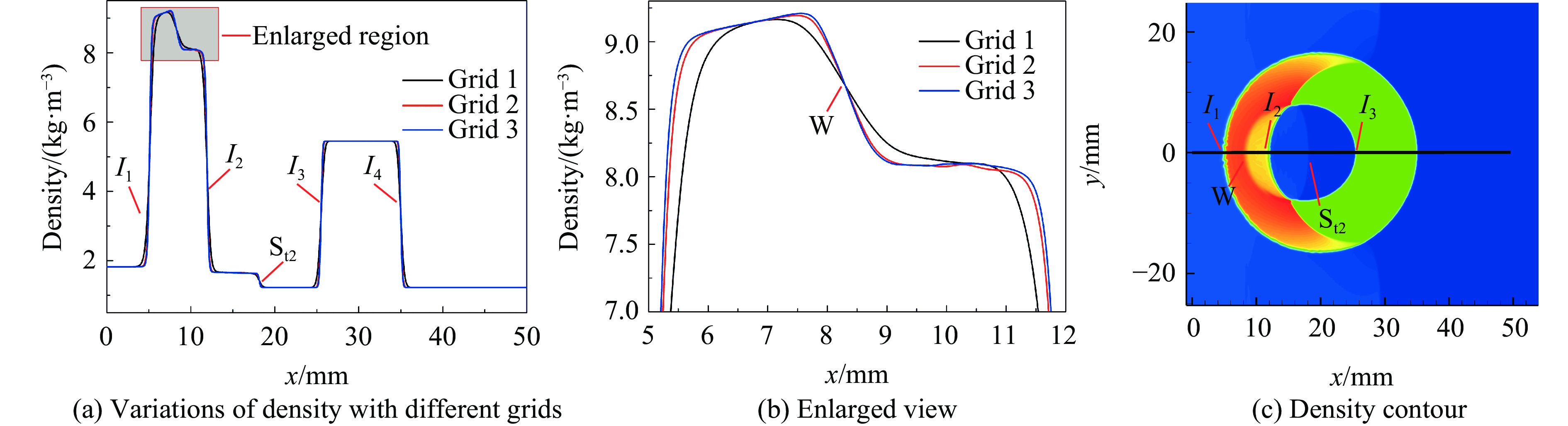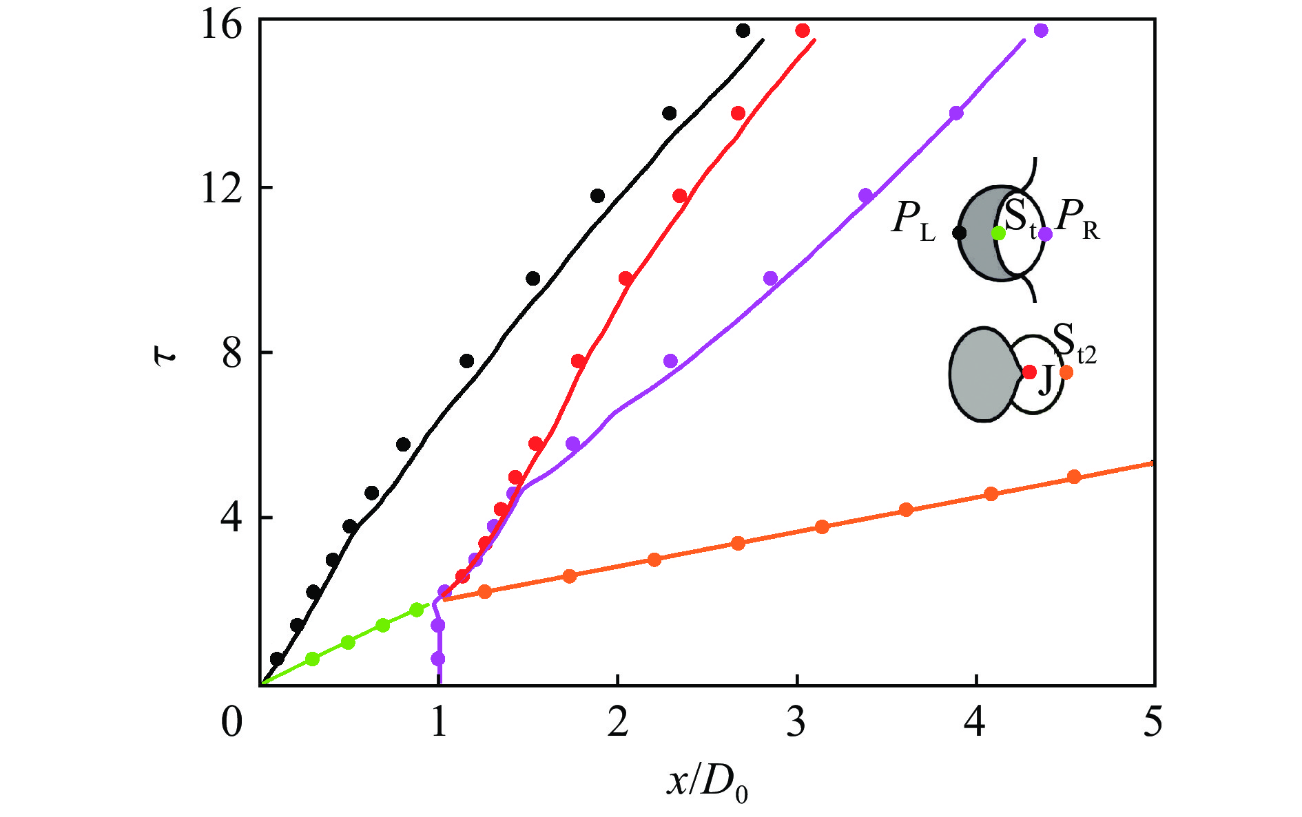 摘要: 基于可压缩多组分Navier-Stokes控制方程,结合5阶加权本质无振荡格式以及网格自适应加密技术和level-set方法,数值模拟了平面激波(Ma=1.23)与环形SF6气柱(内外半径分别为8和17.5 mm)界面的相互作用过程。相比于之前的实验结果,数值模拟结果揭示了入射激波在界面内4次透射过程中的复杂波系结构,观察到透射激波在内部界面传播时形成自由前导折射结构并向自由前导冯诺依曼折射结构转换的波系演变过程;另外,界面内的复杂激波结构诱导内部下游界面上的涡量发生了3次反向;在界面演化后期,内部界面形成的“射流”结构与下游界面相互作用,诱导界面形成一对主涡、一对次级涡以及一个反向“射流”结构。定量分析了环形界面长度、宽度、位移、环量以及混合率的变化情况,结果表明,内部气柱的存在减弱了前期小涡结构合并形成大涡结构过程中对界面高度与长度的影响,同时提高了重质气体与环境气体的混合率。
