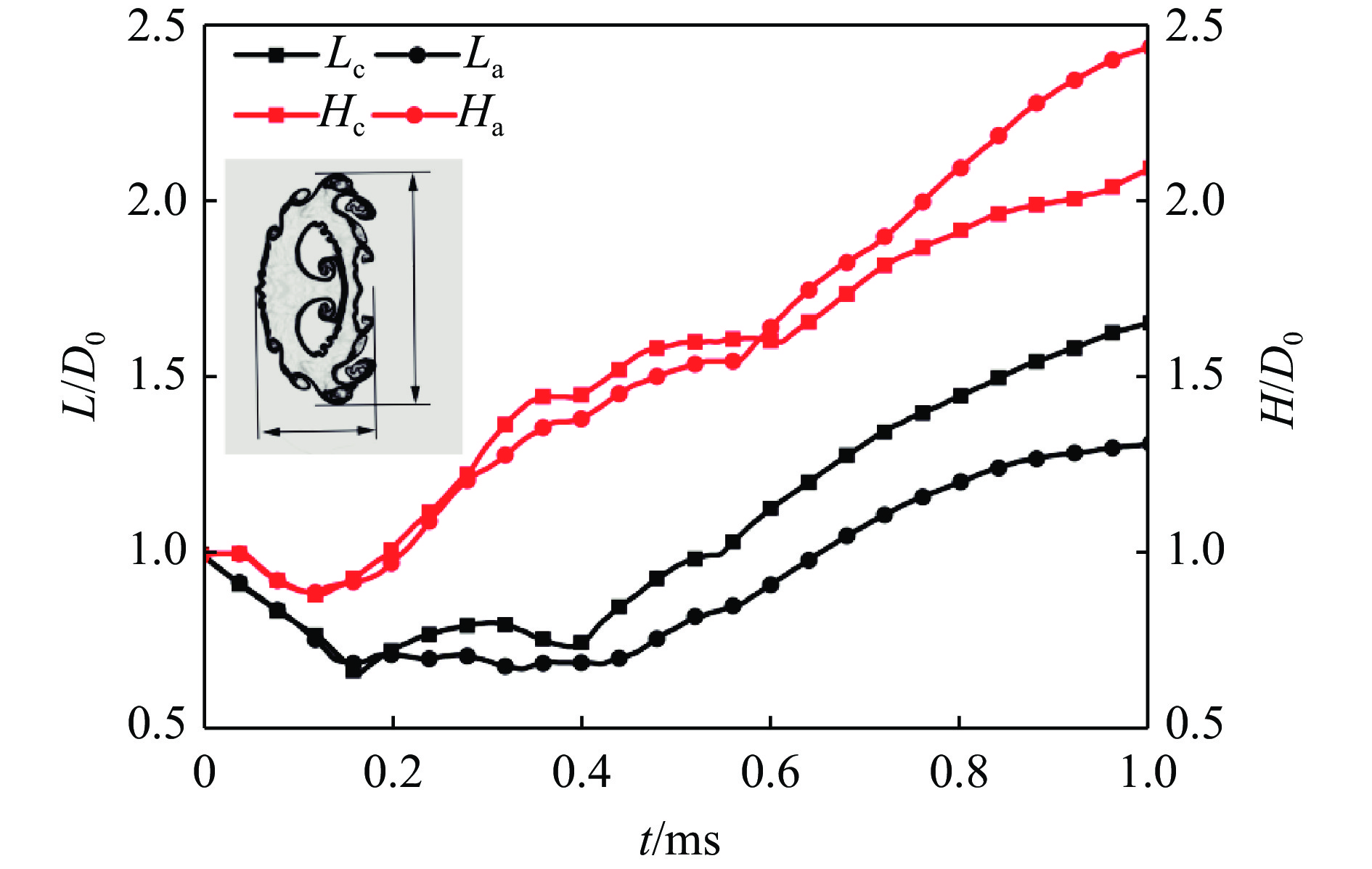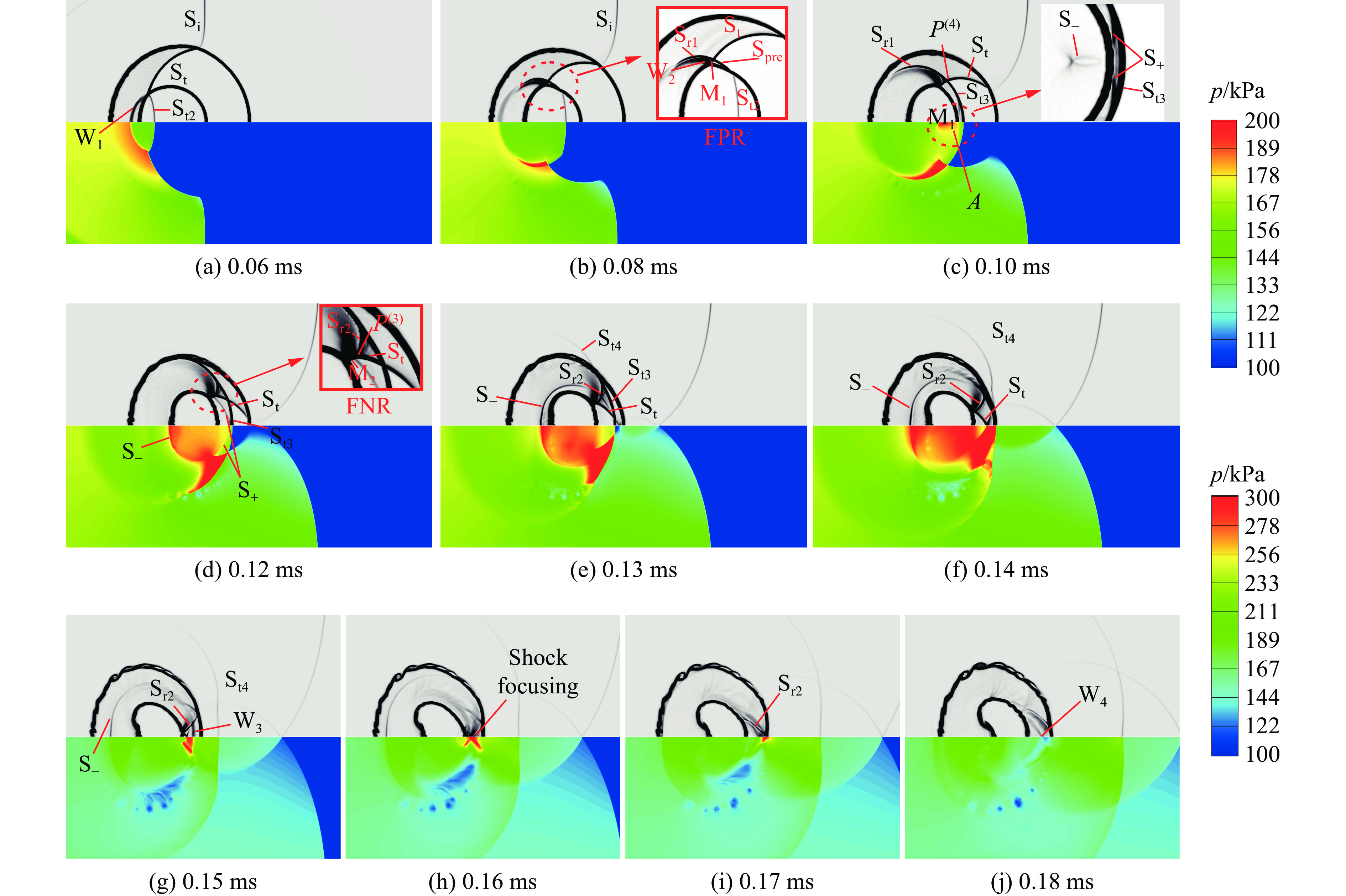 Abstract: Based on the compressible multicomponent Navier-Stokes equations, the interaction of a planar shock wave (Ma=1.23) with an annular SF6 cylinder whose inner and outer radii were set as 8 and 17.5 mm respectively was numerically studied. The simulation was conducted based on the finite volume method. For capturing the complex shock and vortex structures as well as the interfaces, the adaptive mesh refinement method, level set method, and fifth-order weighted essentially non-oscillatory scheme were used for the simulation. The adaptive mesh refinement method dynamically refined the uniform Cartesian grids around the multiple moving shocks and accelerated interfaces. The level set method tracked the interface, while the fifth-order weighted essentially non-oscillatory scheme captured discontinuities such as shock waves and contact surfaces. Time advancement was achieved with the third-order strong-stability-preserving Runge-Kutta method. Compared with the previous experimental results, numerical results revealed the complex evolution of shock wave structures generated in the process of four shock transmissions in the annular cylinder. It is found that the transition from free precursor refraction to free precursor von Neumann refraction occurs when the transmitted shock wave passes through the inner cylinder. In addition, the complex shock structures that developed between the inner and outer downstream interfaces cause the pressure gradient direction to reverse several times on the inner downstream interface, which eventually leads to three reversals of vorticity on the inner downstream interface. In the later stage, the “jet” structure formed on the inner cylinder would impact the downstream interfaces, and finally induces the interfaces to generate a pair of primary vortices, a pair of secondary vortices and a reverse “jet”. Quantitative analyses of the variation of the length, width, displacement, the circulation and mixing rate of the annular cylinder were conducted. The results demonstrate that the presence of the inner cylinder attenuates the influence on the height and length of the annular cylinder during the process of small vortexes merging into the large vortexes in the early stage, and increases the mixing rate of the heavy gas and the ambient gas.-