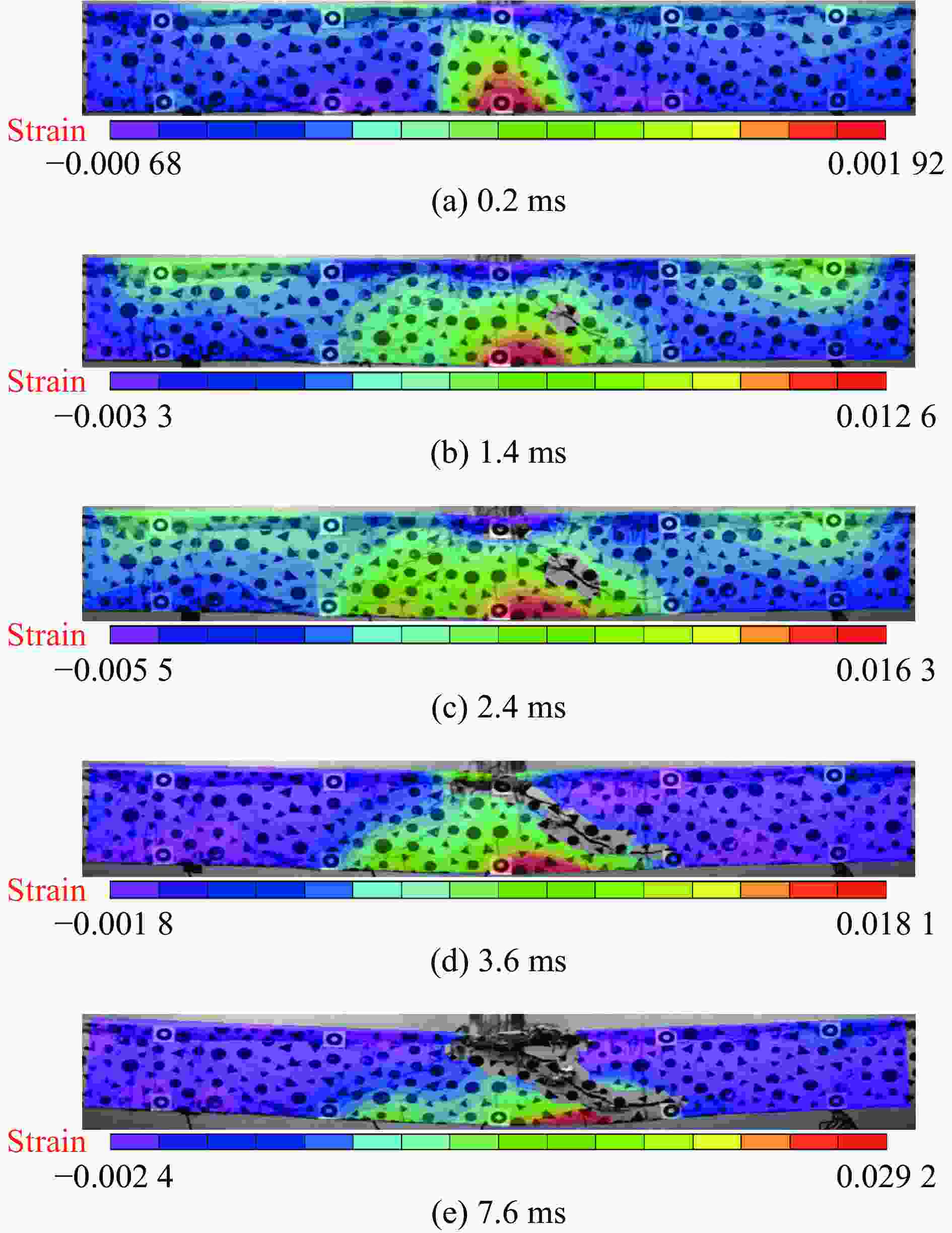 试件编号 加载速度v/(m·s−1) 破坏模式 破坏模式的转化 B1-S 静载 弯曲破坏 弯曲破坏→弯剪破坏→剪切破坏→冲切破坏 B1-3.13 3.13 弯曲破坏 B1-5.42 5.42 弯剪破坏 B1-7.00 7.00 剪切破坏 B1-9.39 9.39 冲切破坏 B2-S 静载 弯曲破坏 弯曲破坏→弯剪破坏→剪切破坏 B2-3.13 3.13 弯曲破坏 B2-5.42 5.42 弯曲破坏 B2-7.00 7.00 弯剪破坏 B2-9.39 9.39 剪切破坏 B3-S 静载 剪弯破坏 弯曲破坏→弯剪破坏→剪切破坏→冲切破坏 B3-3.13 3.13 弯曲破坏 B3-5.42 5.42 弯剪破坏 B3-9.39 9.39 弯剪破坏 B3-12.12 12.12 冲切破坏 B4-S 静载 弯曲破坏 弯曲破坏→弯剪破坏 B4-3.13 3.13 弯曲破坏 B4-5.42 5.42 弯曲破坏 B4-7.00 7.00 弯曲破坏 B4-9.39 9.39 弯剪破坏 -