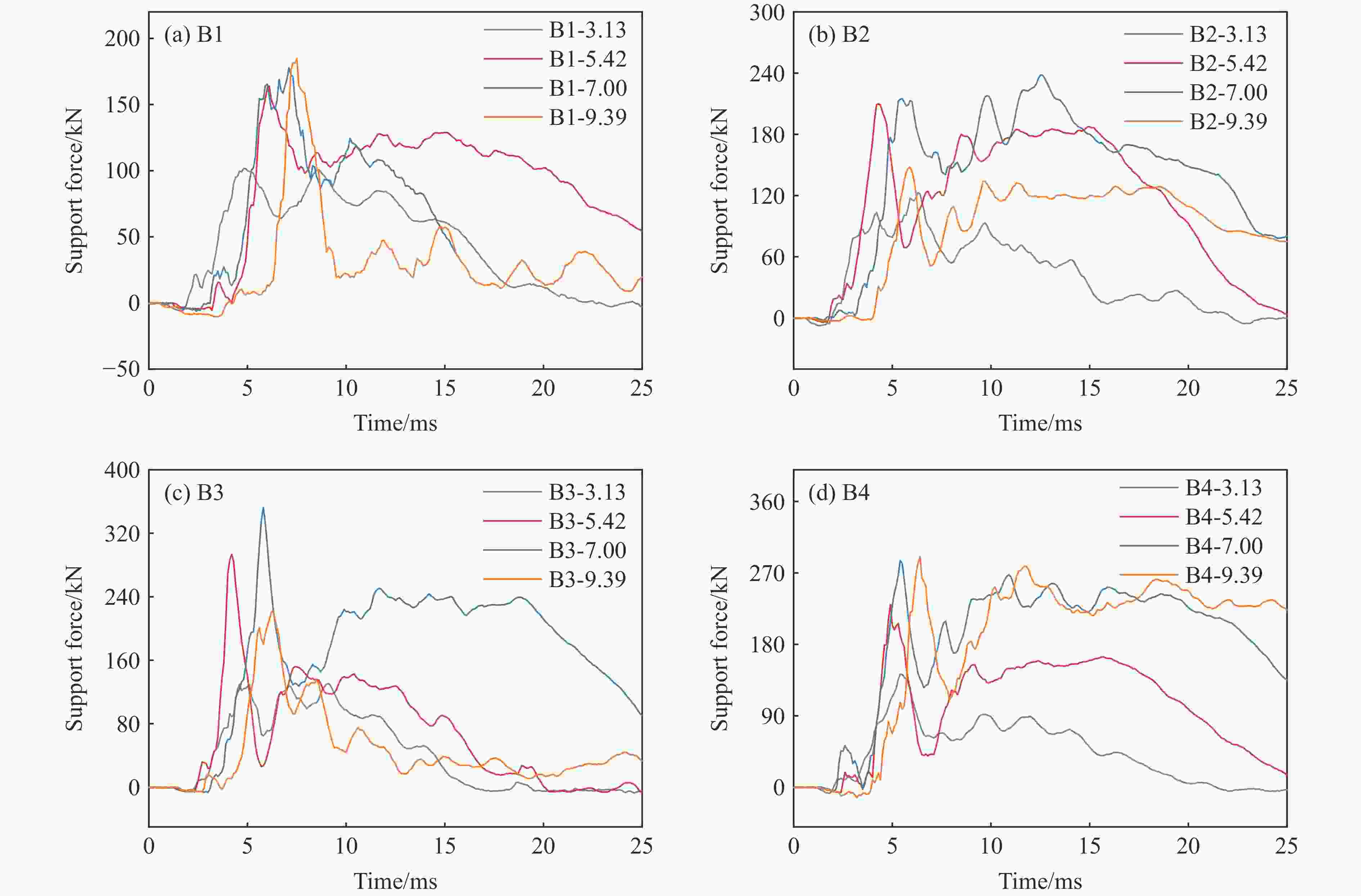 试件 xy/mm Fy/kN xu/mm Fu/kN B1-S 8.14 29.81 35.86 36.96 B2-S 6.97 29.76 31.75 38.48 B3-S 8.82 49.57 39.86 55.08 B4-S 6.25 31.96 31.64 39.03 表 3 落锤冲击试验结果