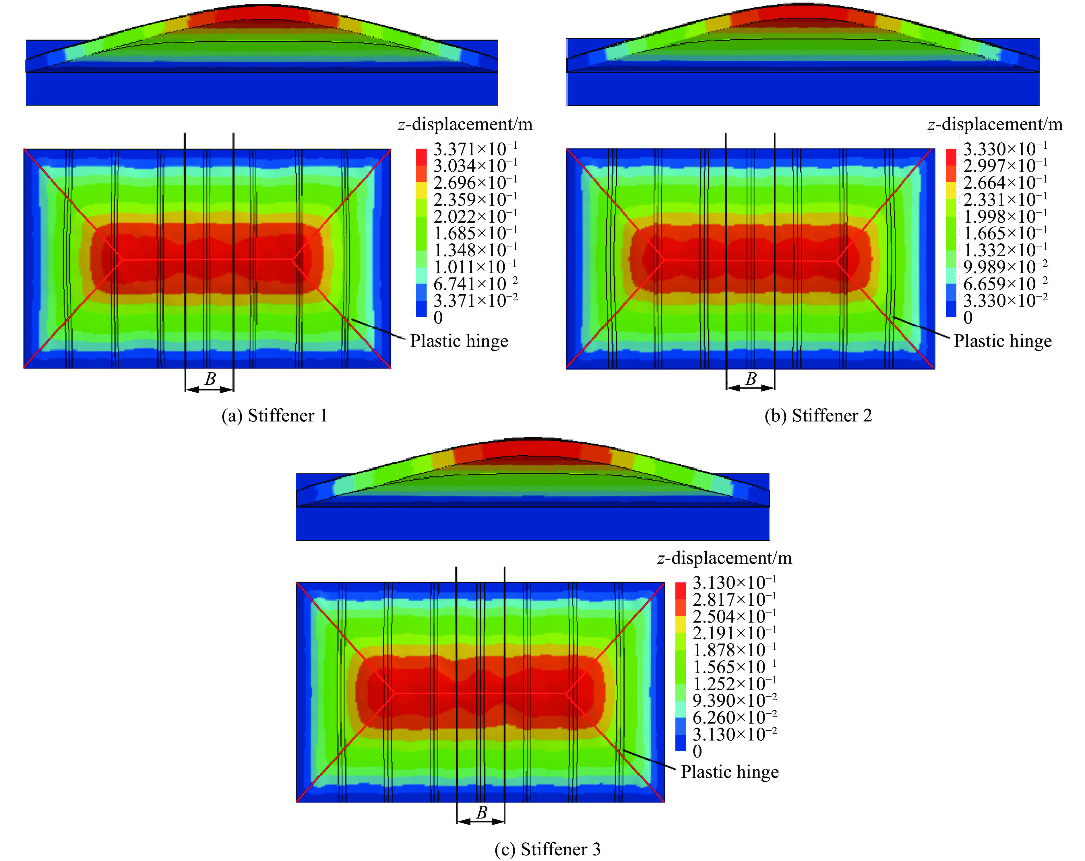 舱壁 最大永久变形量/mm 误差/% 实验 模拟 S1 39.0 41.7 6.92 S2 37.0 39.2 5.95 S3 31.5 33.4 6.03 S4 27.5 27.2 1.09 表 5 单向加筋板变形量对比