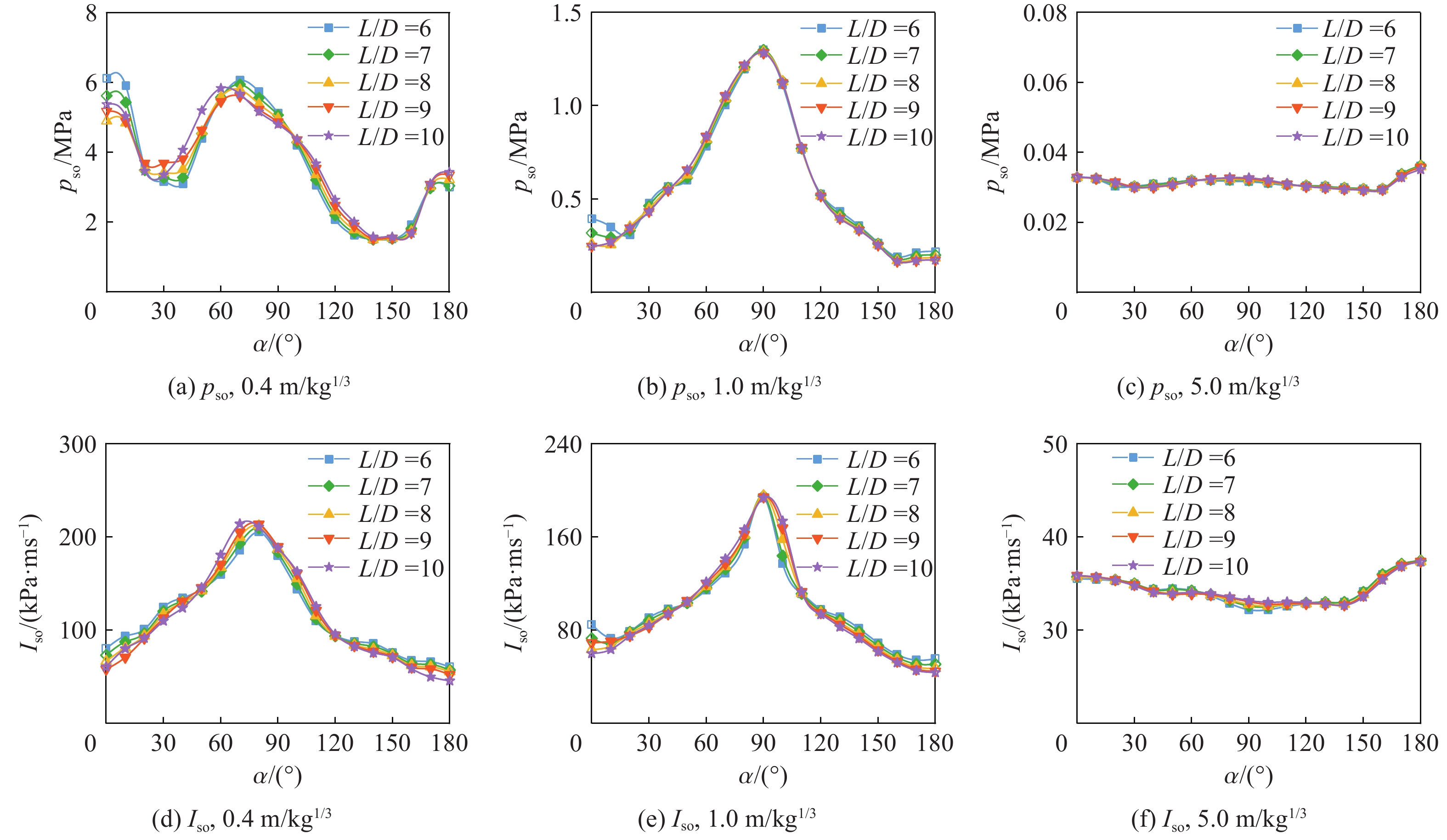 Ma Z/(m·kg−1/3) δd/% α=0° α=45° α=90° α=135° α=180° 1 0.3 2.88 0.76 0.97 0.18 9.08 0.4 0.40 0.19 0.03 0.41 6.46 0.5 2.63 0.71 0.42 0.35 2.94 4 0.3 16.41 0.93 7.67 1.40 29.46 0.4 7.75 1.10 4.57 5.15 14.64 0.5 3.66 2.63 2.71 8.14 5.78 表 2 峰值超压的拟合系数