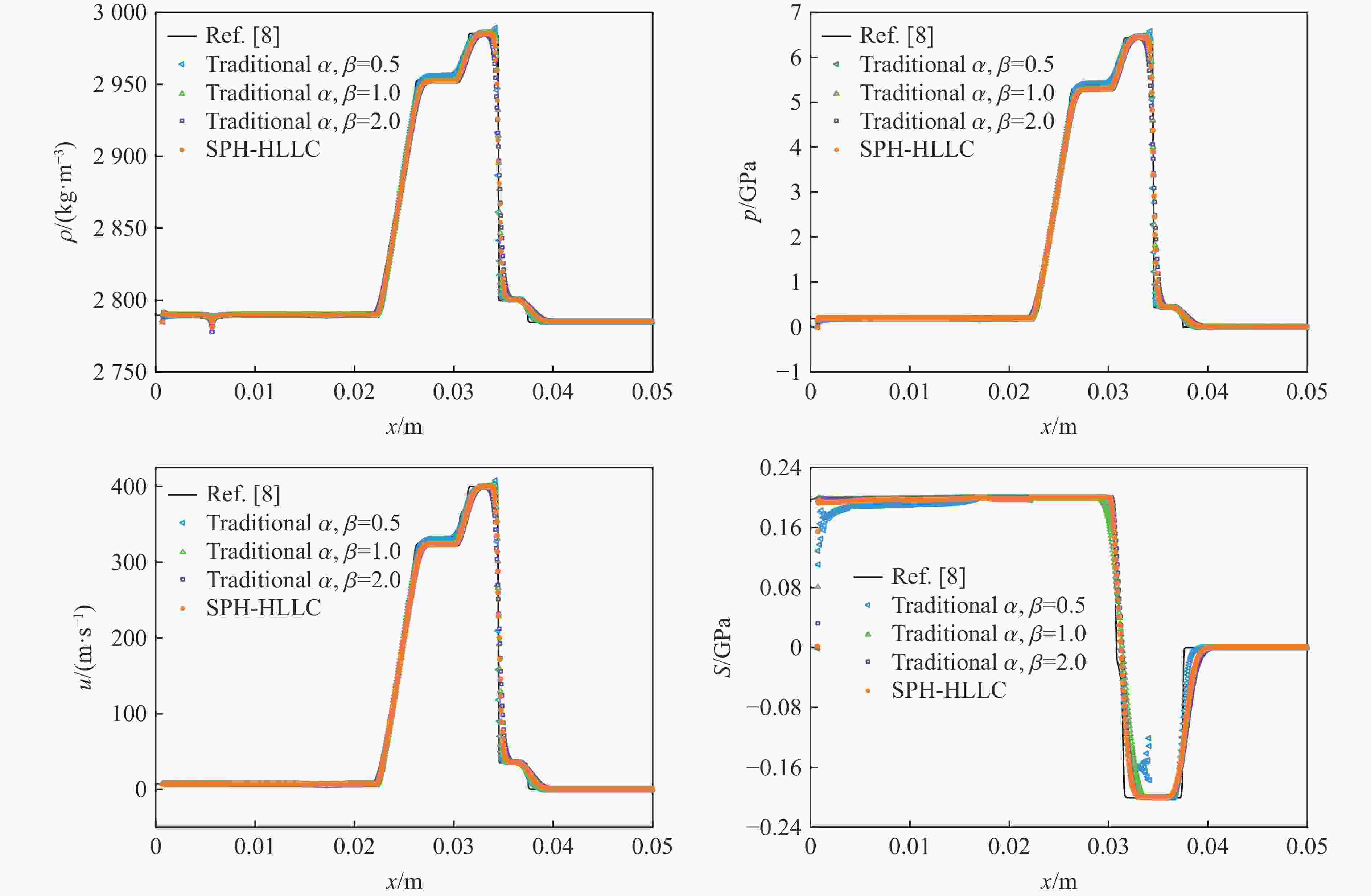 算例 ρ/(kg·m−3) u/(m·s−1) Y0/MPa μ/GPa a0/(m·s−1) ρ0/(kg·m−3) s Γ0 坐标区间/mm t/μs Wilkins 左侧 2785 800 300 27.6 5328 2785 1.338 2 0 ~ 5 5 右侧 2785 0 300 27.6 5328 2785 1.338 2 5 ~ 50 表 3 铜铝材料撞击算例的相关参数