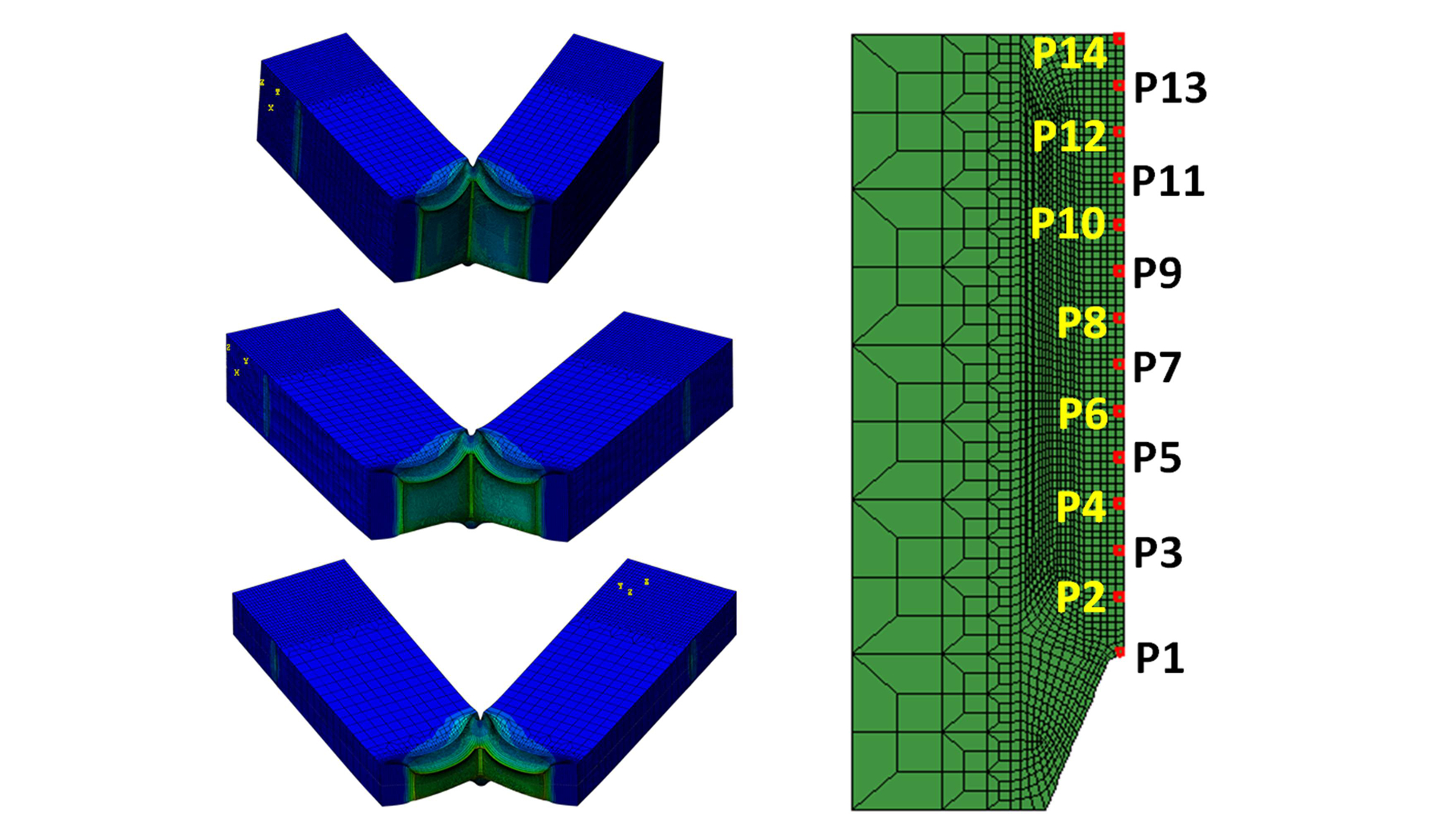 摘要: 结合夏比冲击试验和ABAQUS显式动力数值模拟,对Q370d钢进行了Johnson-Cook失效模型参数研究。首先,在不考虑材料失效的情况下,通过3种不同厚度的无缺口试件冲击实验对有限元模型参数设置和材料本构模型的准确性进行了验证,同时还讨论了试件断裂区网格的合适尺寸;在此基础上,基于正交设计,通过大量的有限元数值模拟得到失效模型参数样本,利用回归分析求得冲击功与失效模型参数的回归方程组;最后结合夏比V型缺口冲击试验,求解Q370d钢的失效模型参数,并对断裂截面的力学特性进行了分析,可为工程应用提供参考。Abstract: This paper aims to obtain the parameters for the failure model based on the Charpy impact test, which has been widely used to study dynamic fracture properties of metallic materials. Based on the explicit dynamic finite element method in ABAQUS, FEM model of Charpy impact test was conducted. We began by discussing the accuracy of the parameters of JC constitutive model and the grid size of the fracture section of V-notch specimen. Then, based on the orthogonal design method, we designed a set of parameters for JC failure model and obtained using finite element calculation the samples of the parameters and impact energy. Next, we obtained the regression equations containing the parameters and impact energy by regression analysis and finally, by solving these regression equations, we achieved the comparatively accurate parameters for JC failure model for Q370d steel. These parameters will be useful for engineering applications and our method will be a valuable way to obtain parameters for other kinds of materials, especially without necessarily meeting the conditions of performing some tests.