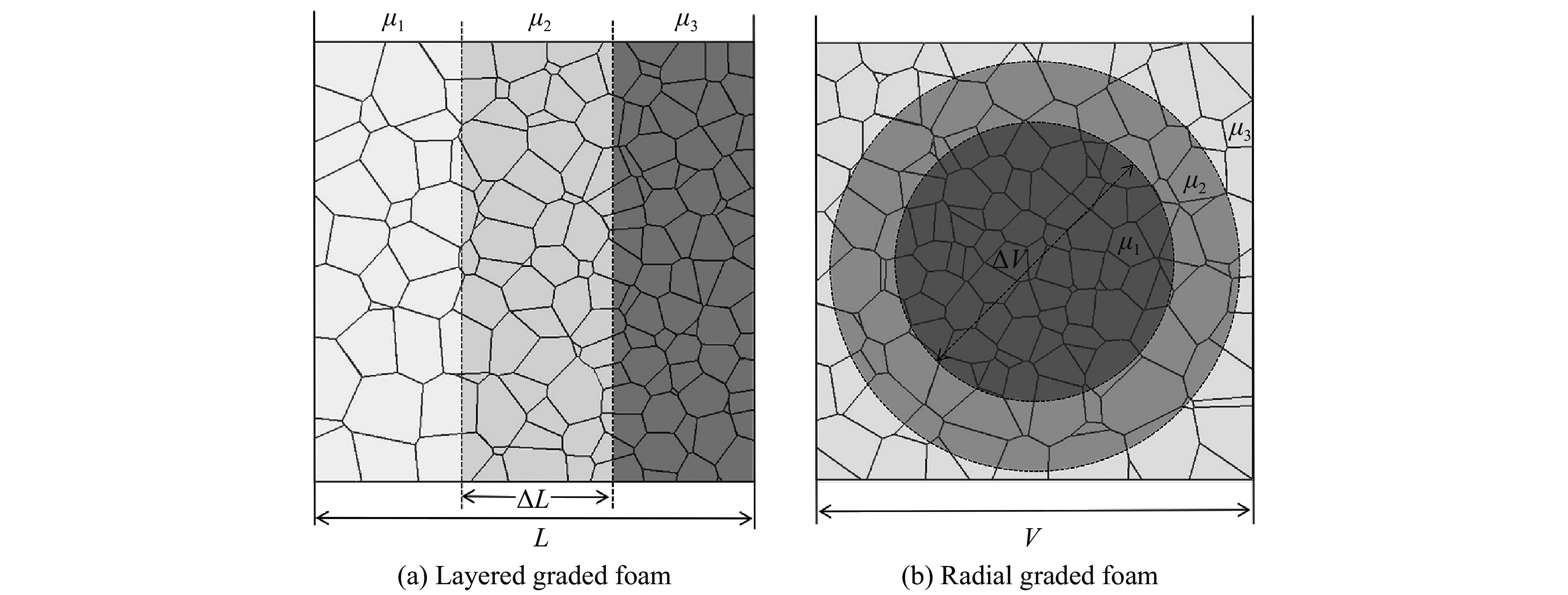 Abstract: Based on the generation method of layered density graded foam, new radial density graded foam models were designed by 3D-Voronoi technique, and their mechanical behavior under different impact loads was numerically simulated by finite element software. By analyzing the effects of impact velocity, density gradient and average relative density on the stress of impact end and support end, and energy absorption capacity of metal foams, it is found that the radial positive graded foam has smaller stress values at both ends than the layered positive and negative graded foams, which can simultaneously protect objects at any ends. The stress fluctuation of radial negative graded foam is small, which can ensure the stability of the force received by the object, and the energy absorption values of four metal foams vary alternately at different impact velocities. For the radial graded foam, energy absorption capacity is insensitive to density gradient, but sensitive to gradient direction. The energy absorption capacity of radial negative graded foam is always greater than radial positive graded foam. The larger the average relative density, the greater the stress at both ends, and the energy absorption effect is also enhanced.-