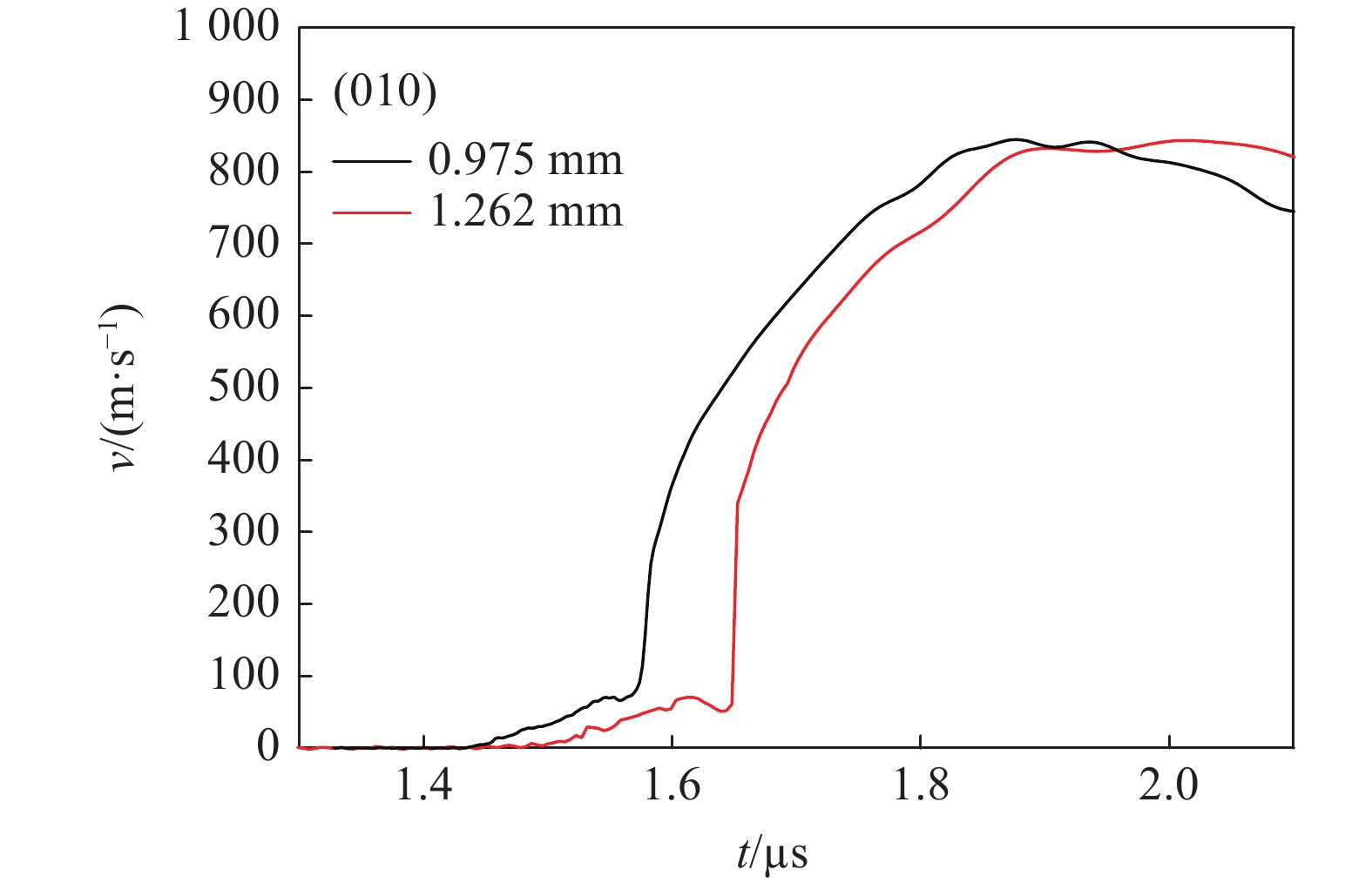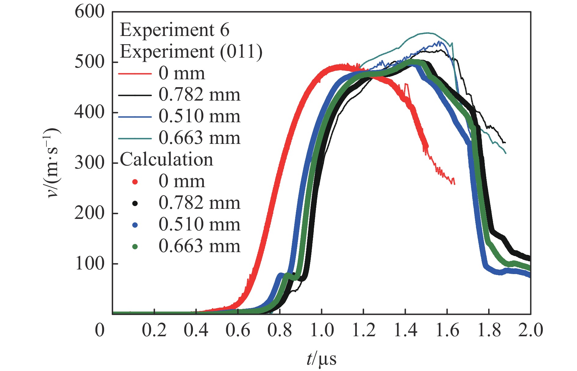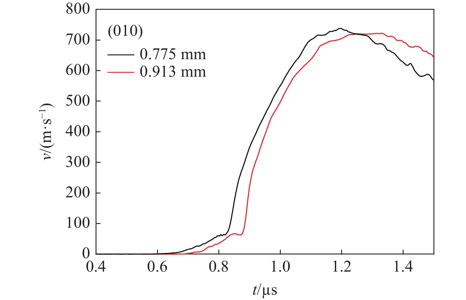 HMX晶向 厚度/mm 屈服速度/(m·s−1) 弹性极限 /GPa (011) 1.398 67.05 0.927 0.510 77.63 1.076 (010) 0.975 69.80 0.966 1.262 70.30 0.973 0.961 63.90 1.263 1.253 71.50 0.990 0.775 63.90 0.883 0.913 67.10 0.928 0.664 69.78 0.966 0.781 59.69 0.824 表 3 模拟计算所用的模型参数