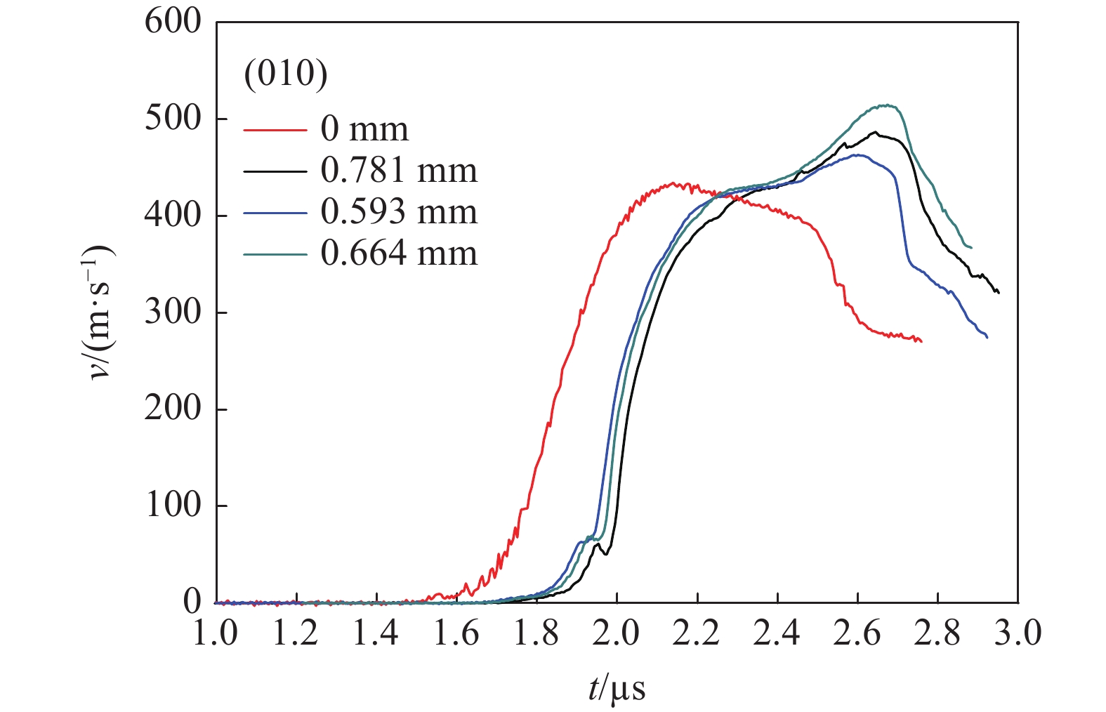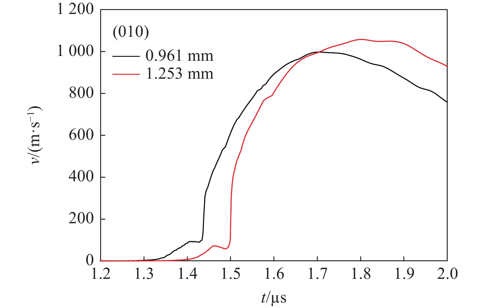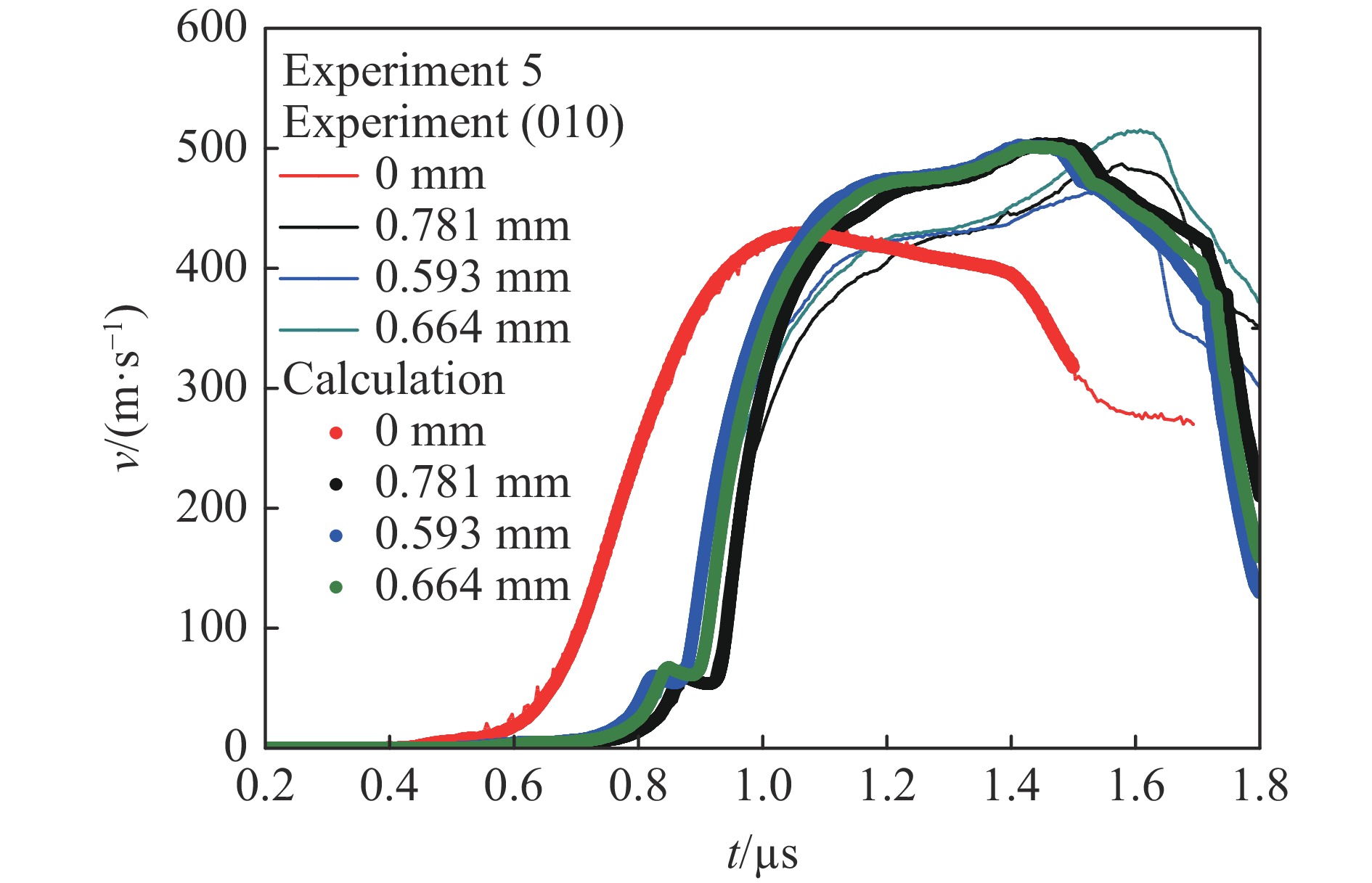 HMX晶向 厚度/mm 屈服速度/(m·s−1) 弹性极限 /GPa (011) 1.398 67.05 0.927 0.510 77.63 1.076 (010) 0.975 69.80 0.966 1.262 70.30 0.973 0.961 63.90 1.263 1.253 71.50 0.990 0.775 63.90 0.883 0.913 67.10 0.928 0.664 69.78 0.966 0.781 59.69 0.824 表 3 模拟计算所用的模型参数