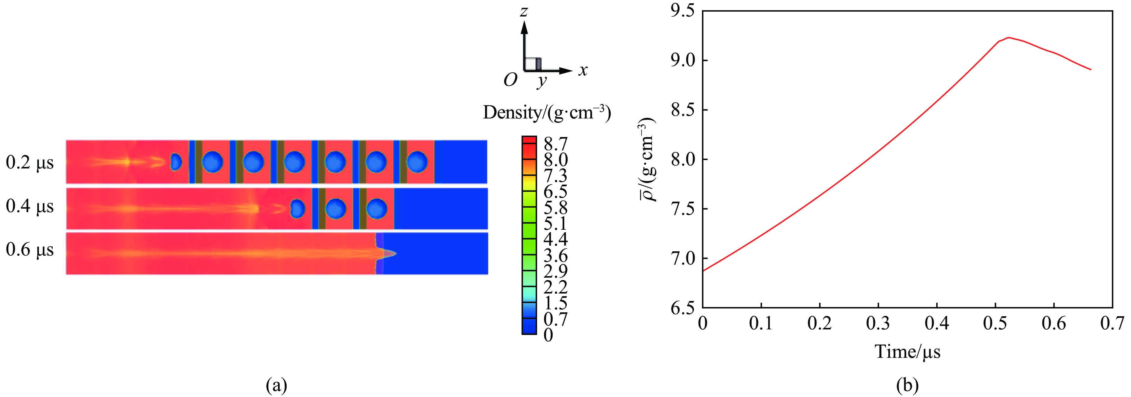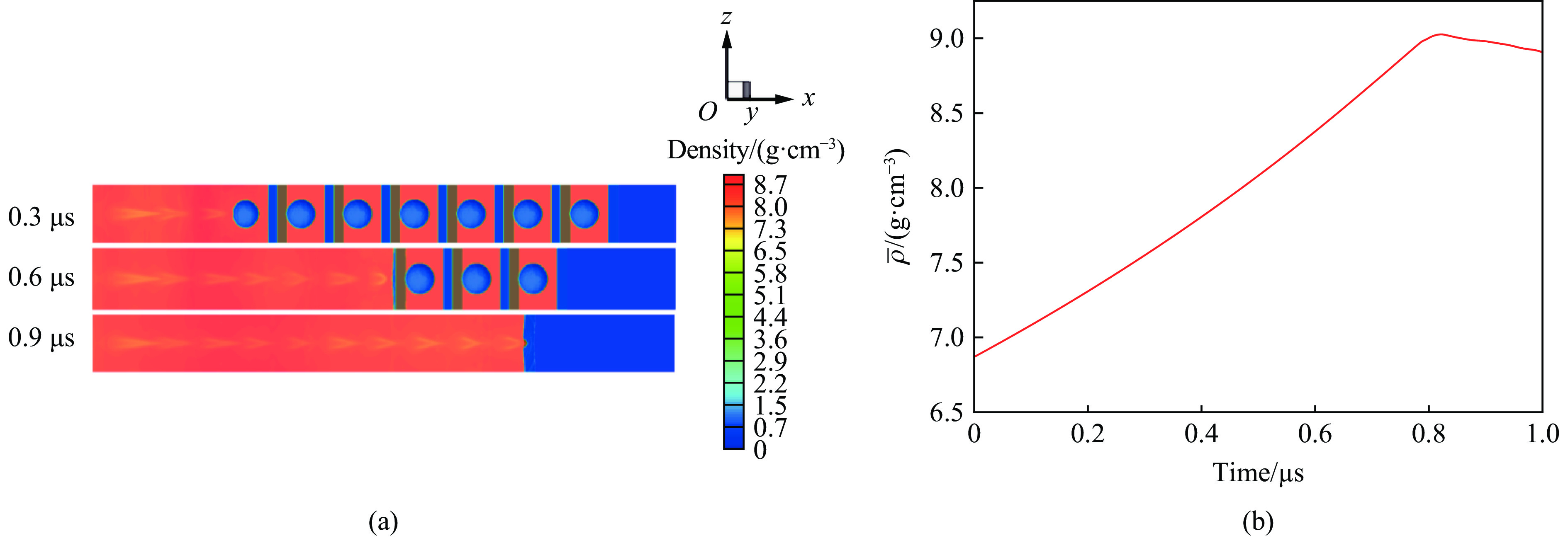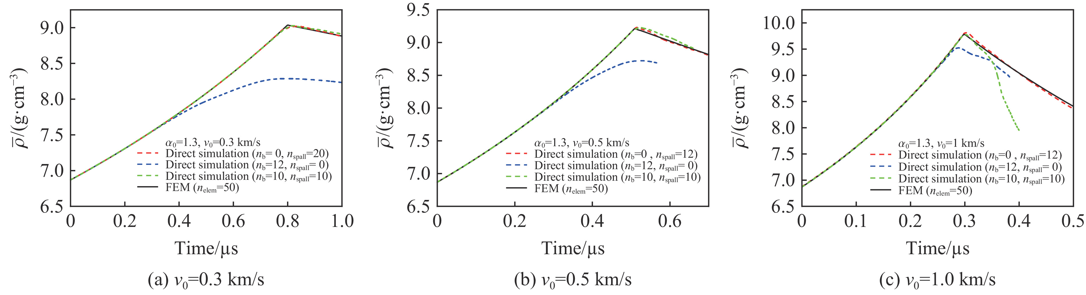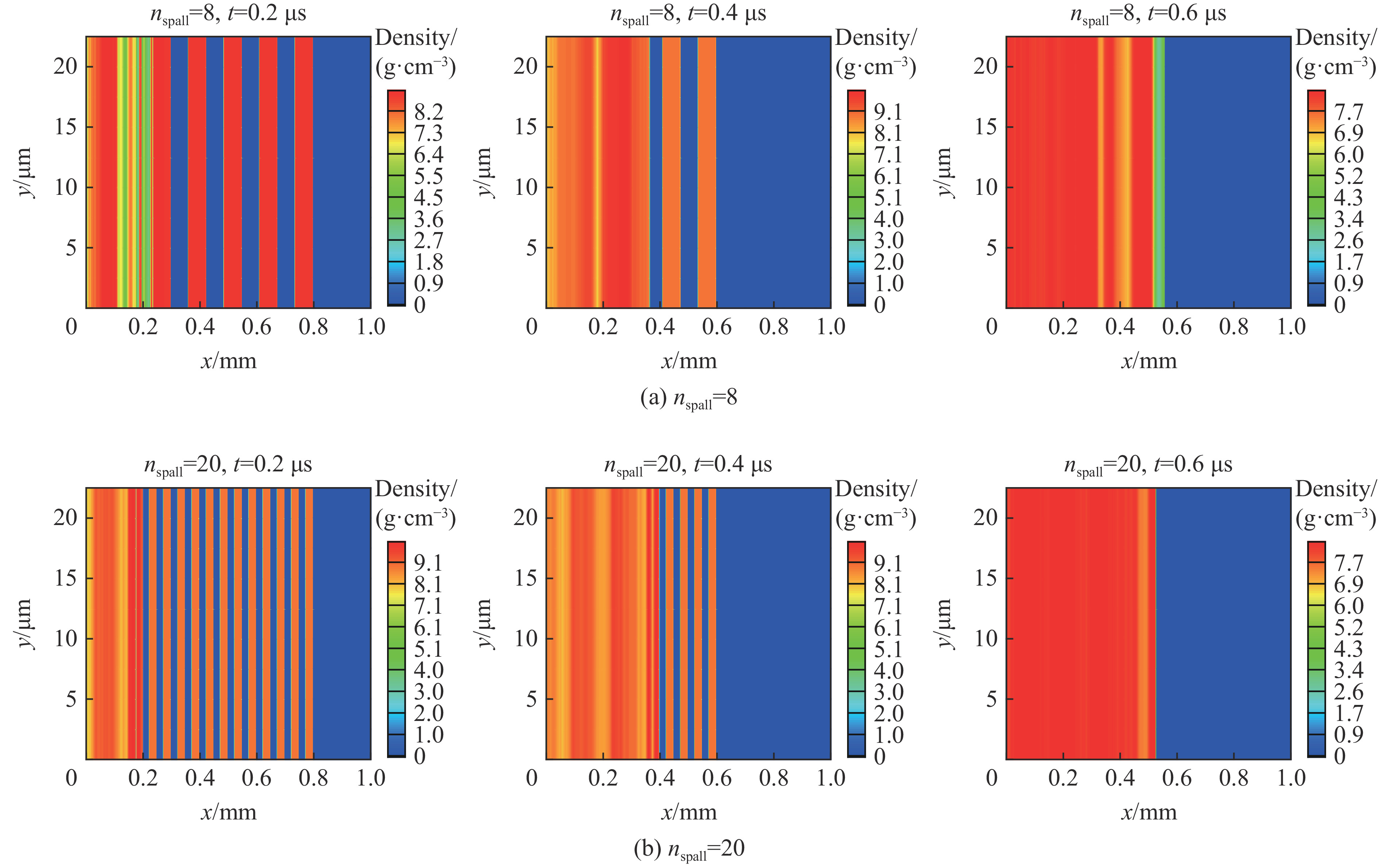 $ {n}_{\rm{b}}=10 $ ,${n}_{\rm{spall}}=10 $ 情况下的密度图和层裂区平均密度随时间的变化Figure 11. Results of the density distribution and average density over time by direct simulations with
