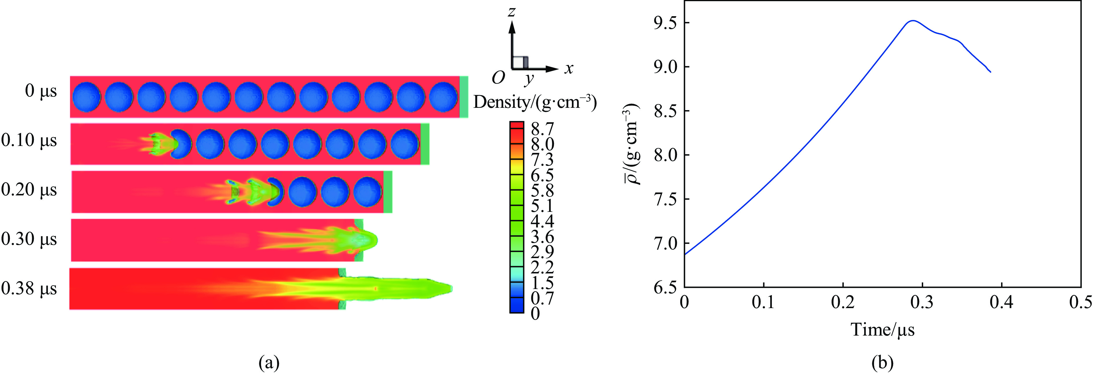 $ {n}_{\rm{b}}=10 $ ,${n}_{\rm{spall}}=10 $ 情况下的密度图和层裂区平均密度随时间的变化Figure 12. Results of the density distribution and average density over time by direct simulations with
