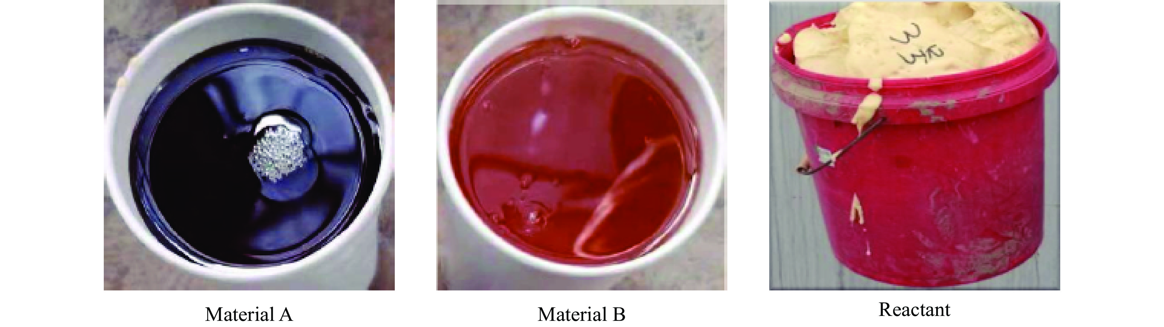 高聚物材料为自主研发的非水反应类双组分发泡型聚氨酯材料,如图1所示,材料A为多异氰酸酯,材料B为多元醇,按照1∶1比例混合后,体积能在10 s内膨胀20~30倍[17],反应生成泡沫状固化物。基于文献[18-20],制作试件采用的高聚物材料,其单轴压缩屈服应力为13.71 MPa,屈服应变为16.9%,极限应变为43.8%,密度为0.2 g/cm3。
