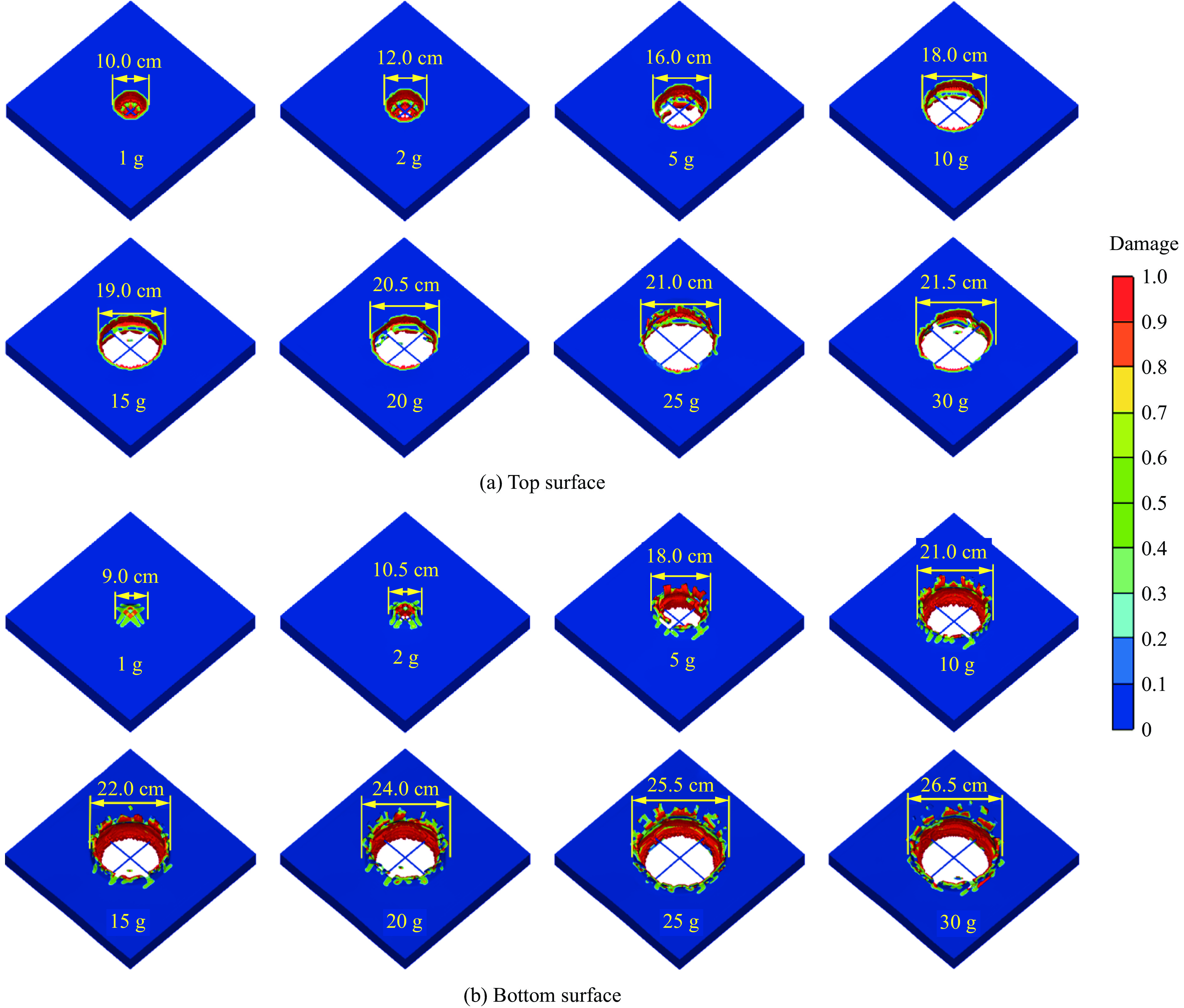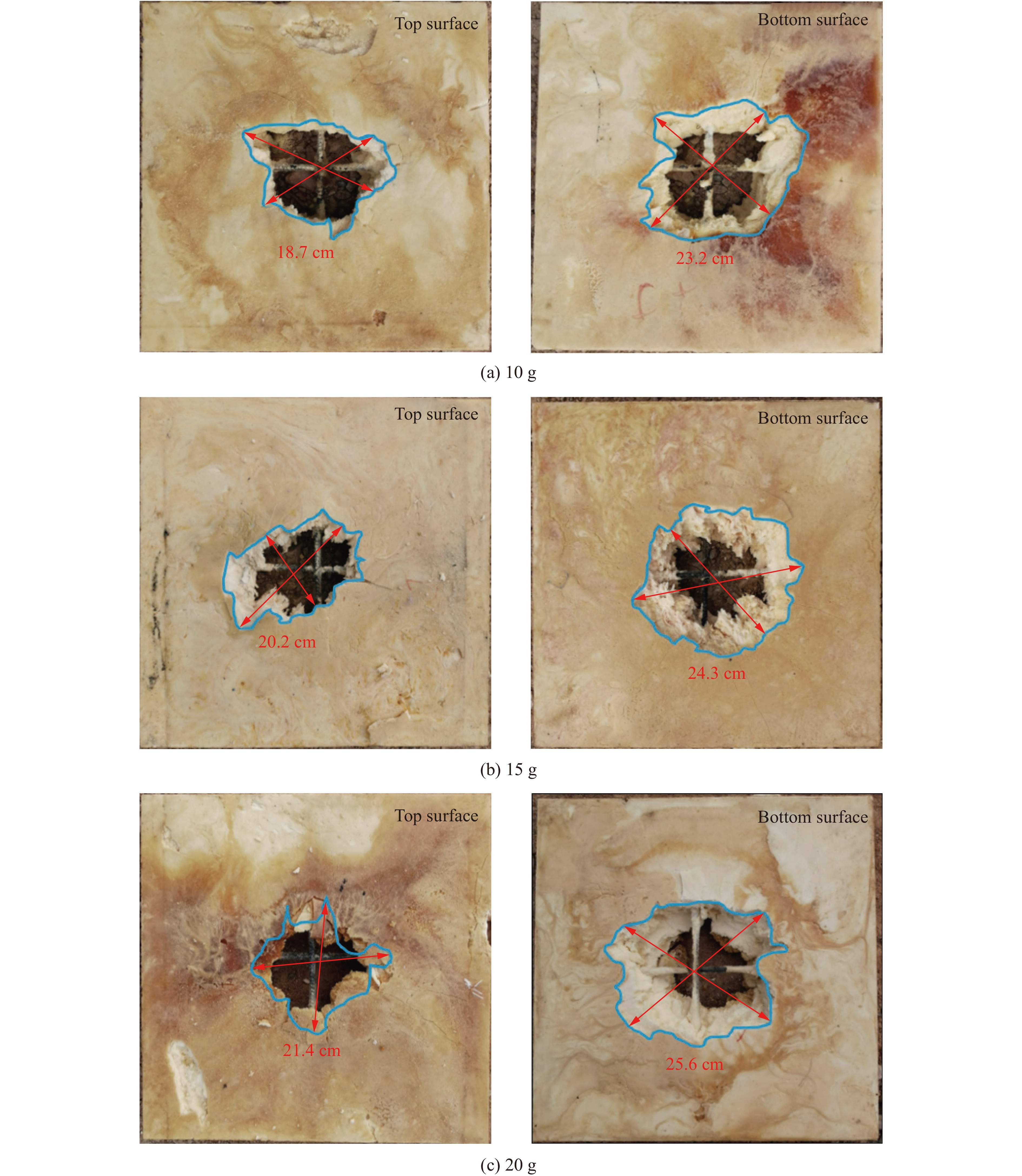 综上可以看出,在接触爆炸作用下,高聚物碎石板的毁伤模式主要为与炸药接触部位的局部冲切穿孔和径向裂纹破坏,且随着药量的增加,高聚物碎石板中部破坏区域逐渐增大。