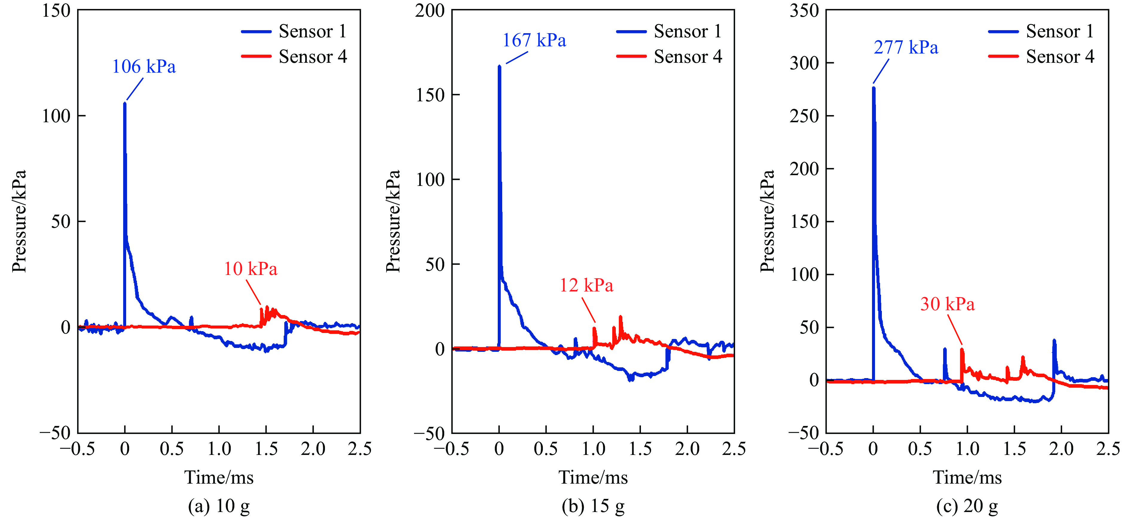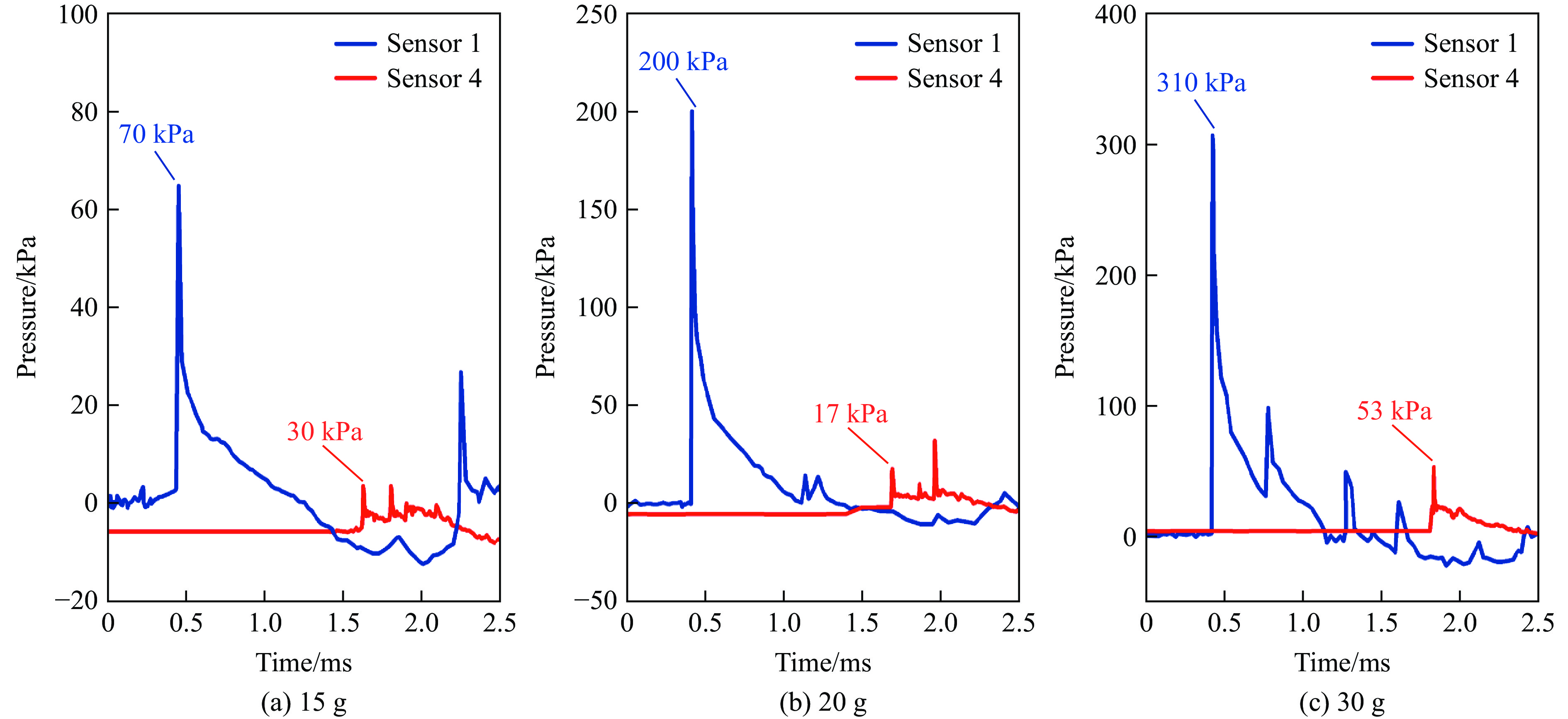 图12为钢筋高聚物板在不同药量接触爆炸作用下测点1和4处的空气冲击波压力时程曲线。与高聚物碎石板试验相同的是,随着炸药量的增加,爆炸冲击波压力峰值逐渐增大,钢筋高聚物板上方测点1处的超压峰值远大于板下方测点4处的超压峰值。与测点1处的超压峰值相比,测点4处的冲击波超压峰值分别衰减了90.57%、92.81%和89.17%。这表明,钢筋高聚物板对爆炸冲击波也具有较好的衰减作用。