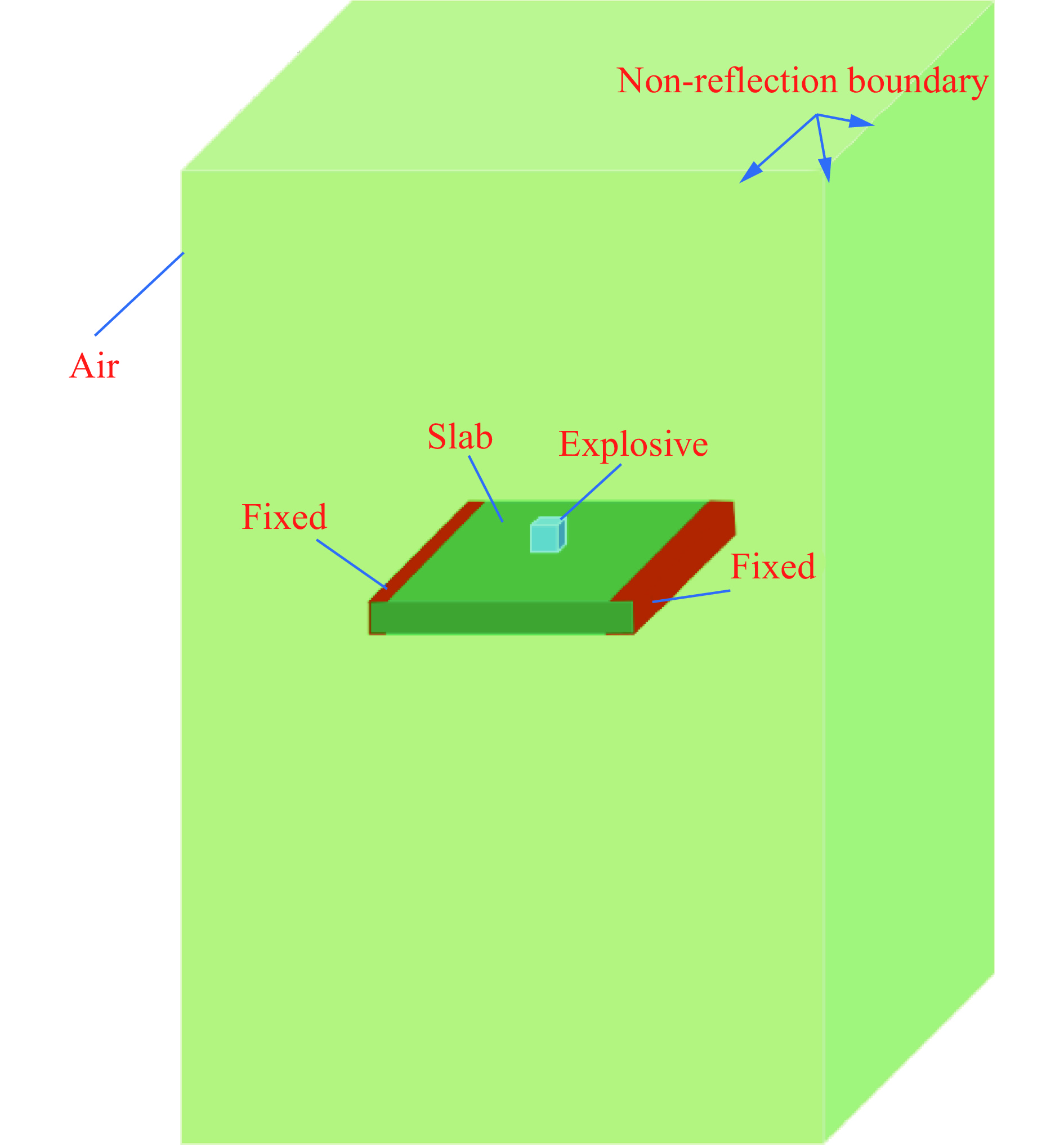 在现场试验中,爆炸荷载的作用时间和结构响应这2种物理现象持续时间较短,很难辨别过程是如何发生的,并且现场爆炸试验费用昂贵,危险性较高。此外,通过现场试验发现,接触爆炸作用下钢筋高聚物板相较于高聚物碎石板的破坏更严重,且钢筋高聚物板制作更简便,其应用更广泛。因此,为进一步探究钢筋高聚物板毁伤特性对起爆药量和试件厚度等参数的敏感性,借助有限元软件AUTODYN,建立全耦合模型,开展数值模拟继续研究。