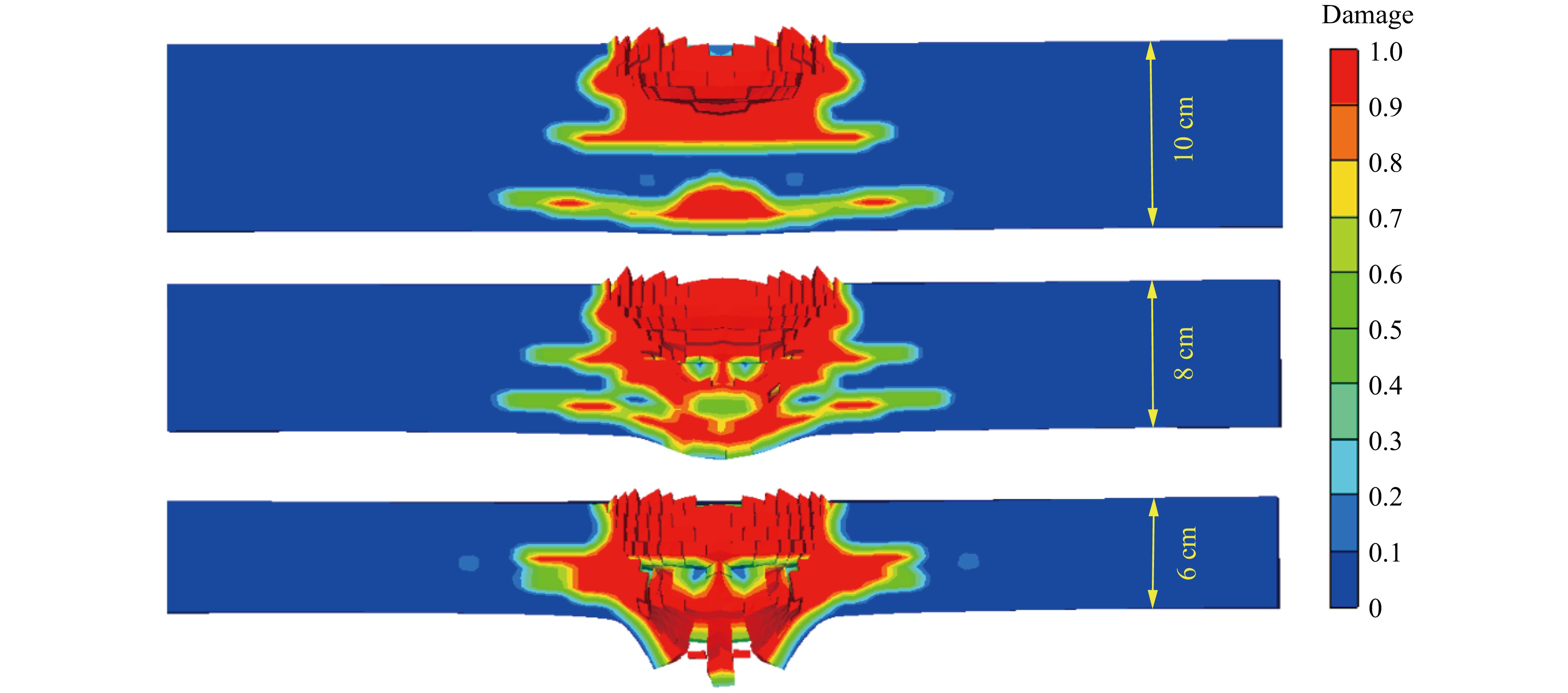 其他参数保持不变,改变钢筋高聚物板的厚度,探究厚度为6、8和10 cm的钢筋高聚物板在接触爆炸作用下的毁伤特性和动态响应。不同厚度的钢筋高聚物板在2 g炸药量接触爆炸作用下的毁伤特征如图18所示。当板厚度为10 cm时,钢筋高聚物板的顶部出现爆坑损伤。当板厚度为8 cm时,钢筋高聚物板的破坏模式为迎爆面爆坑损伤和背爆面剥落损伤。当板厚度为6 cm时,迎爆面出现爆坑破坏,背爆面出现剥落破坏,中部发生冲切穿孔破坏。为了更清楚地分析接触爆炸下钢筋高聚物板的失效模式,图19展示了不同厚度的钢筋高聚物板在2 g炸药量接触爆炸作用下的侧面剖视图。
