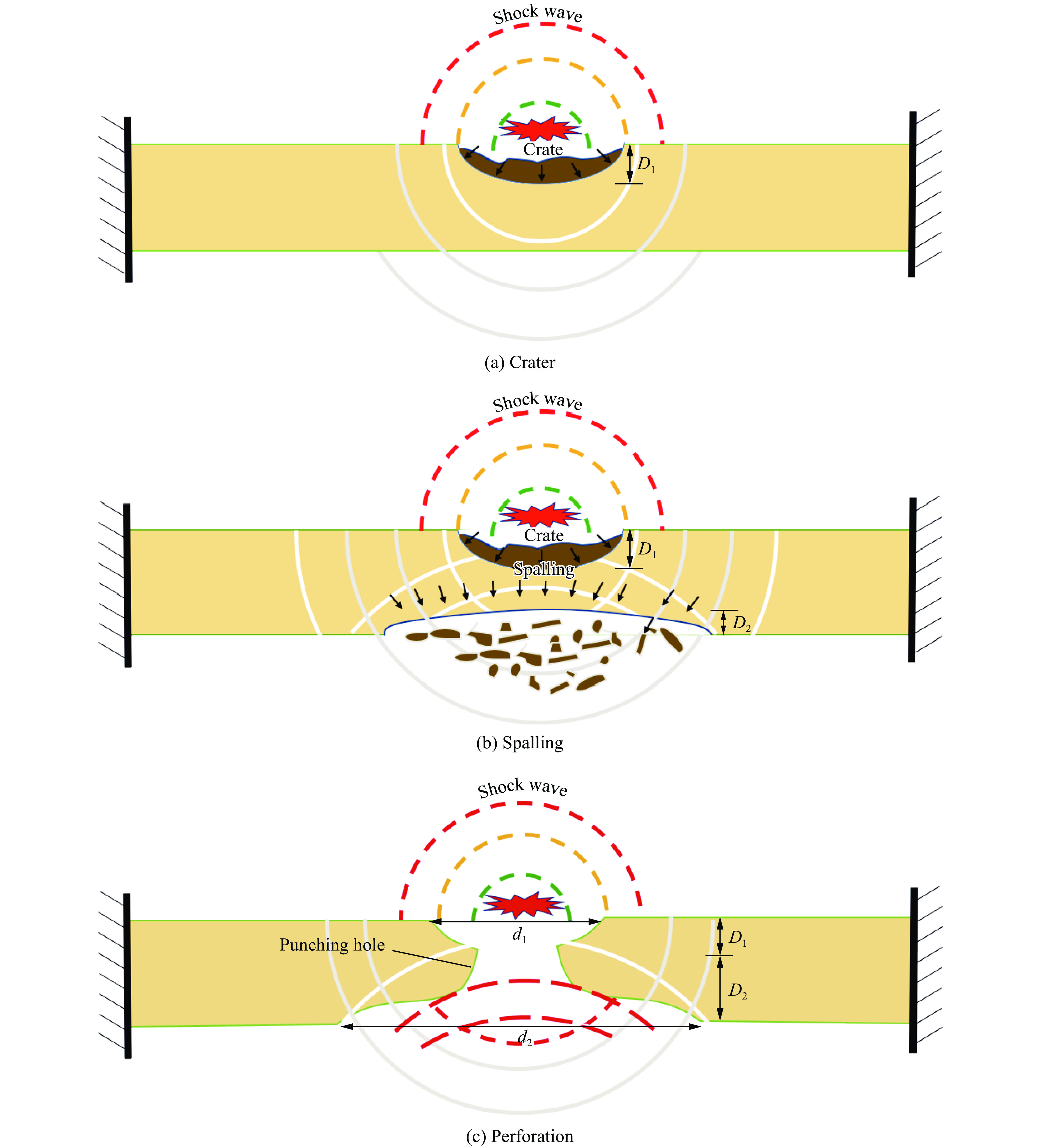 受接触爆炸影响的钢筋高聚物板的毁伤模式见图20,毁伤模式可进一步分为爆坑破坏、剥落损伤和穿孔失效。钢筋将冲击荷载分布在钢筋高聚物板上,从而形成比层裂直径更小的爆坑直径,防止冲孔失效。钢筋高聚物板厚度较小时,爆坑将延伸到下方,并与远端表面的层裂合并,形成穿孔失效模式。