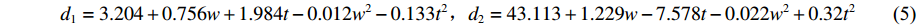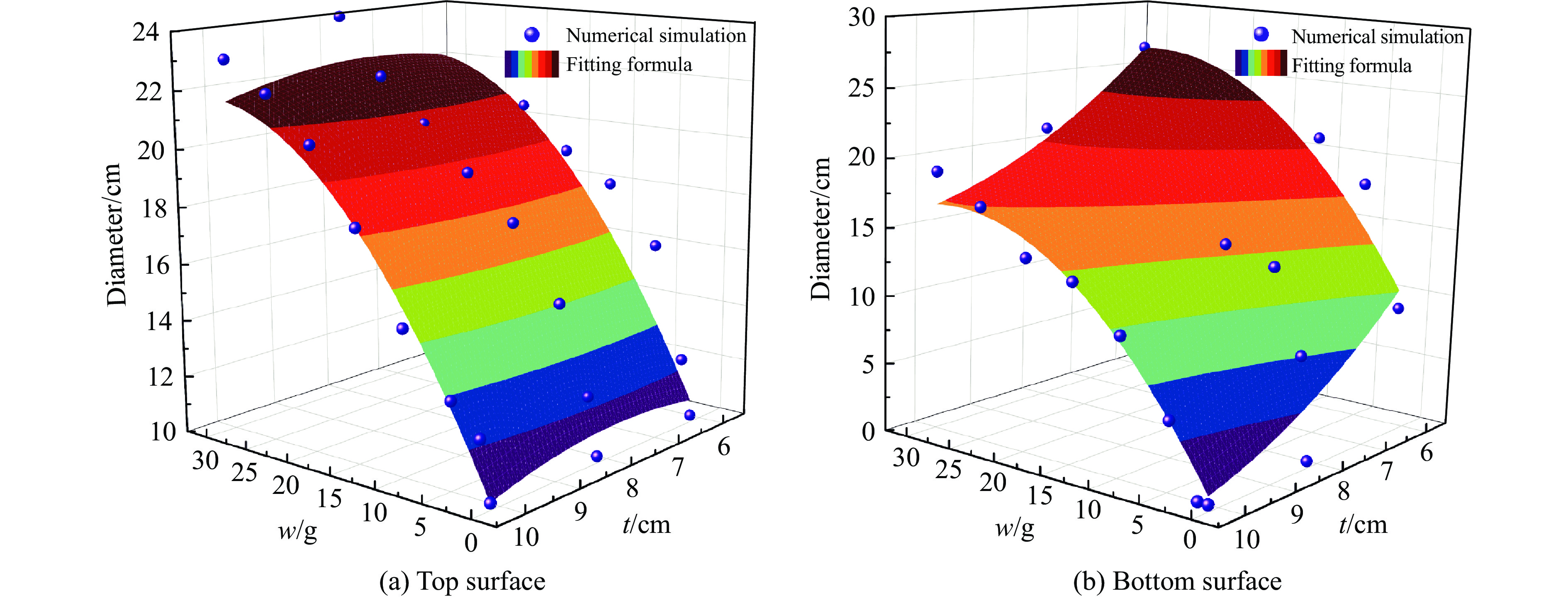 d1=3.204+0.756w+1.984t−0.012w2−0.133t2,d2=43.113+1.229w−7.578t−0.022w2+0.32t2 (5) 式中:d1为迎爆面破坏直径,cm;d2为背爆面破坏直径,cm;w为炸药量,g;t为板的厚度,cm。