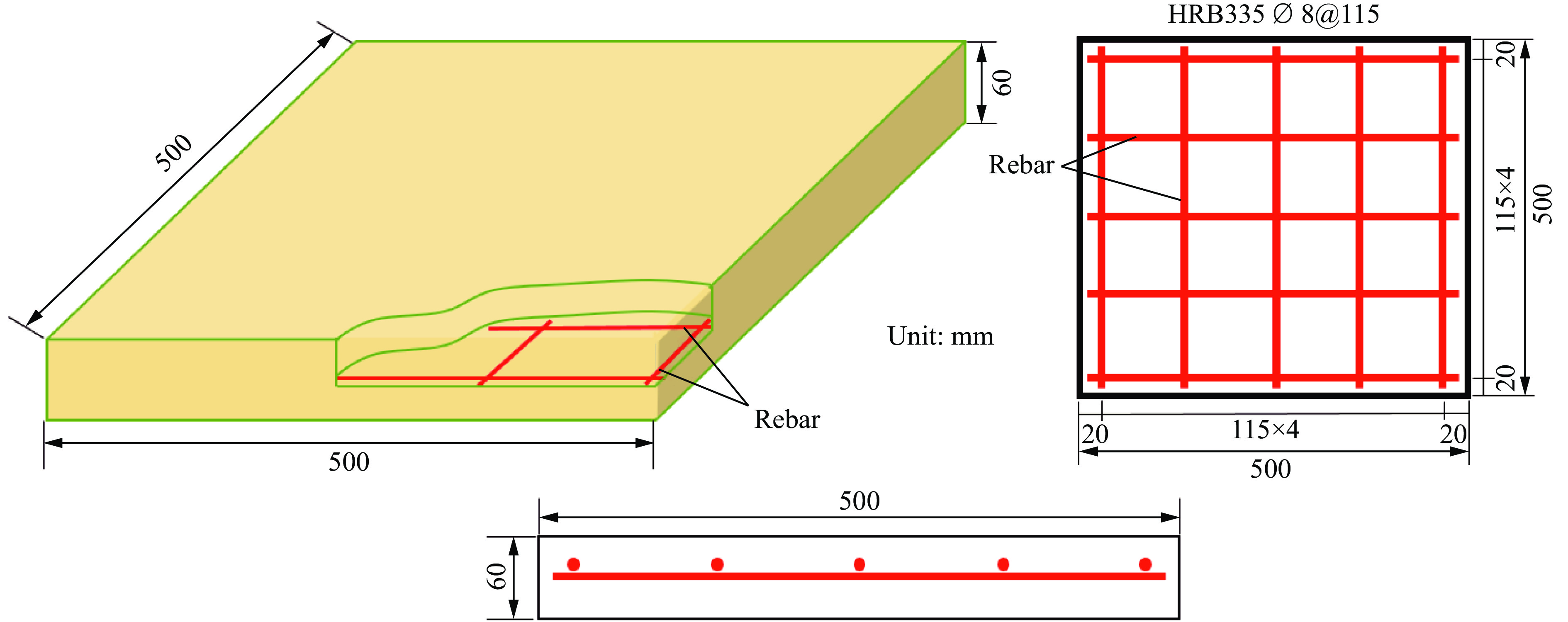 所用钢筋为HRB335型,直径为8 mm,弹性模量为200 GPa,屈服强度为386.7 MPa,抗拉强度为472 MPa[21]。钢筋高聚物板的制备中,钢筋单层排列,横纵间距均为115 mm。