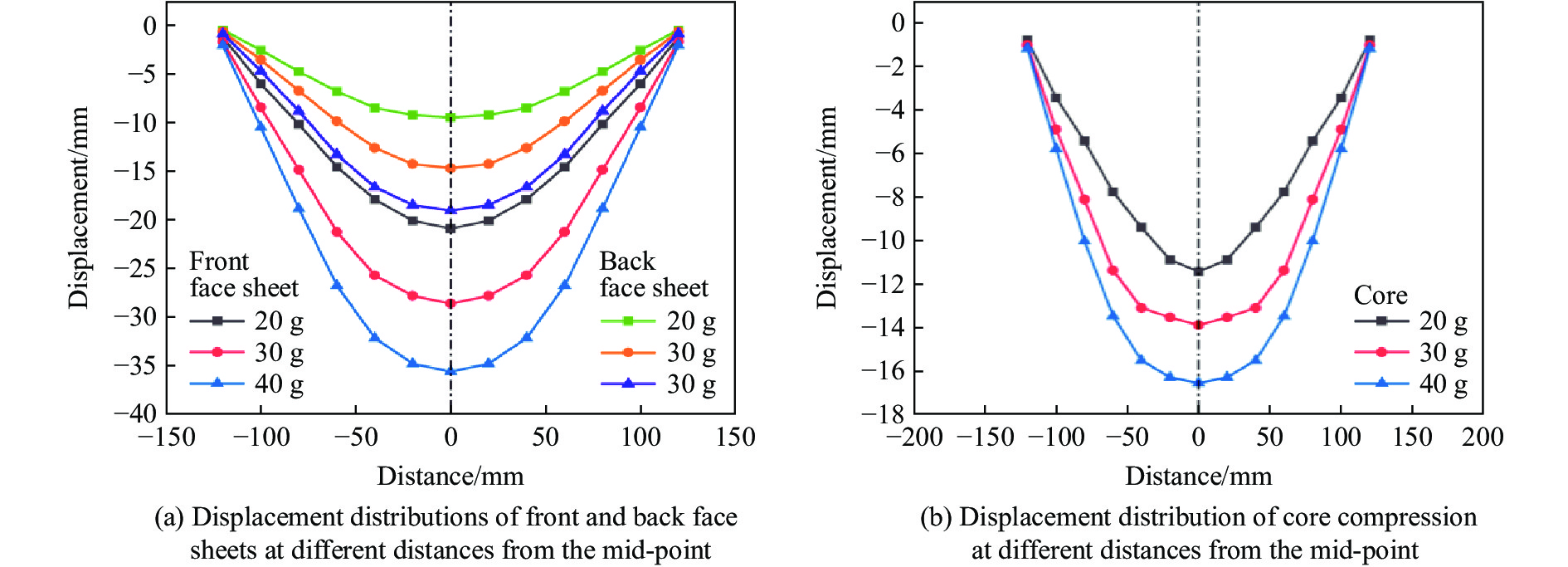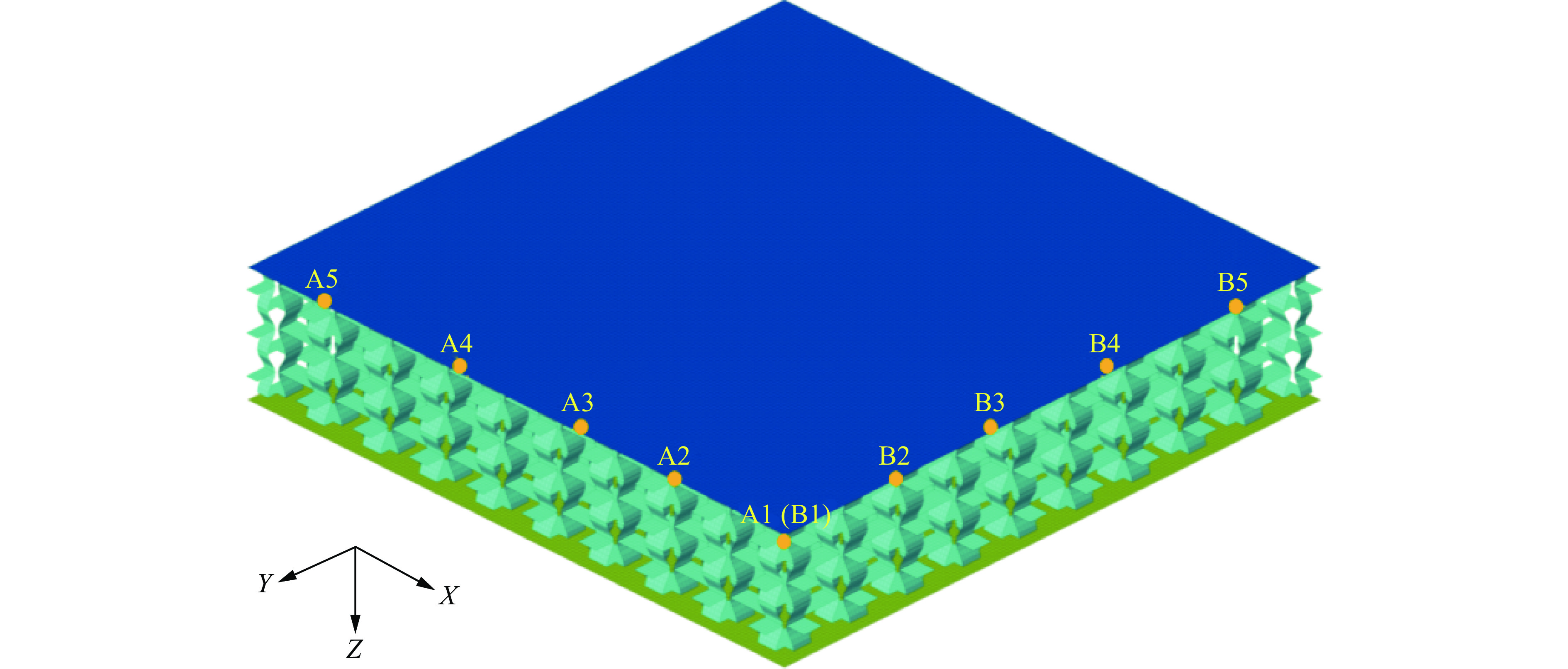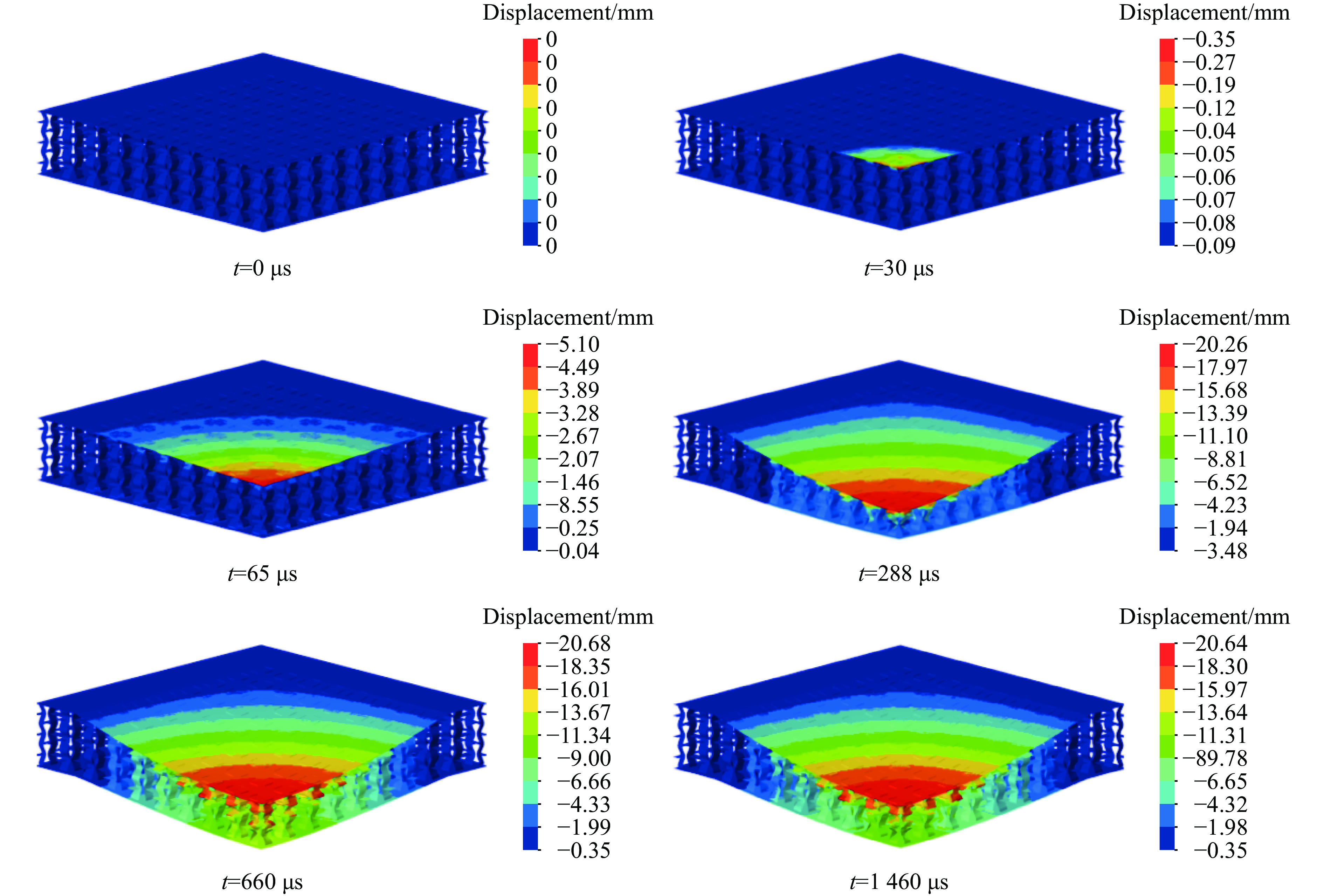 部件 材料 屈服应力/MPa 拉伸强度/MPa 杨氏模量/GPa 密度/(g·cm−3) 泊松比 面板 AL1200 140 160 70 2.7 0.3 芯层 AL5052 70 210 70 2.7 0.3 表 2 爆炸载荷下三维负泊松比夹芯板设计方案
