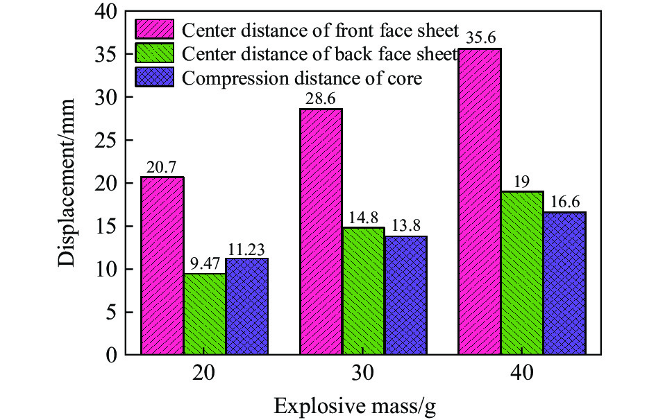 夹芯板 L2/mm 蜂窝边长L1/mm Tc/mm Q/g 爆炸距离/mm S4-1 18.4 5 0.04 10 150 S4-2 18.4 5 0.04 10 100 S3-1 18.4 3 0.04 15 100 S3-2 18.4 3 0.04 20 130 表 4 3种夹芯板的几何信息和模拟结果