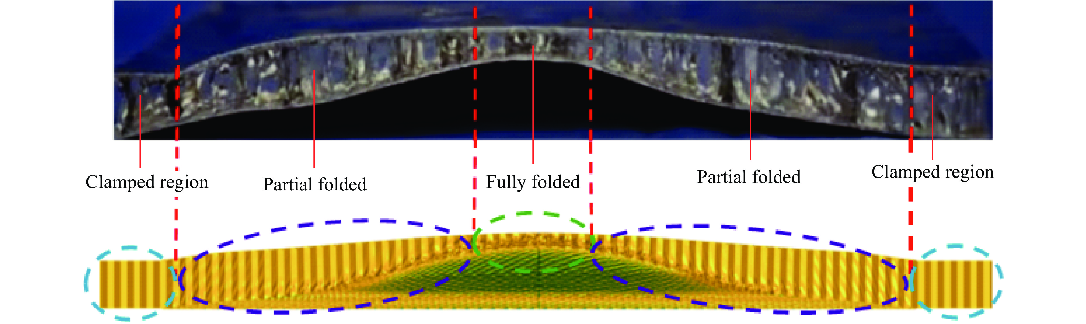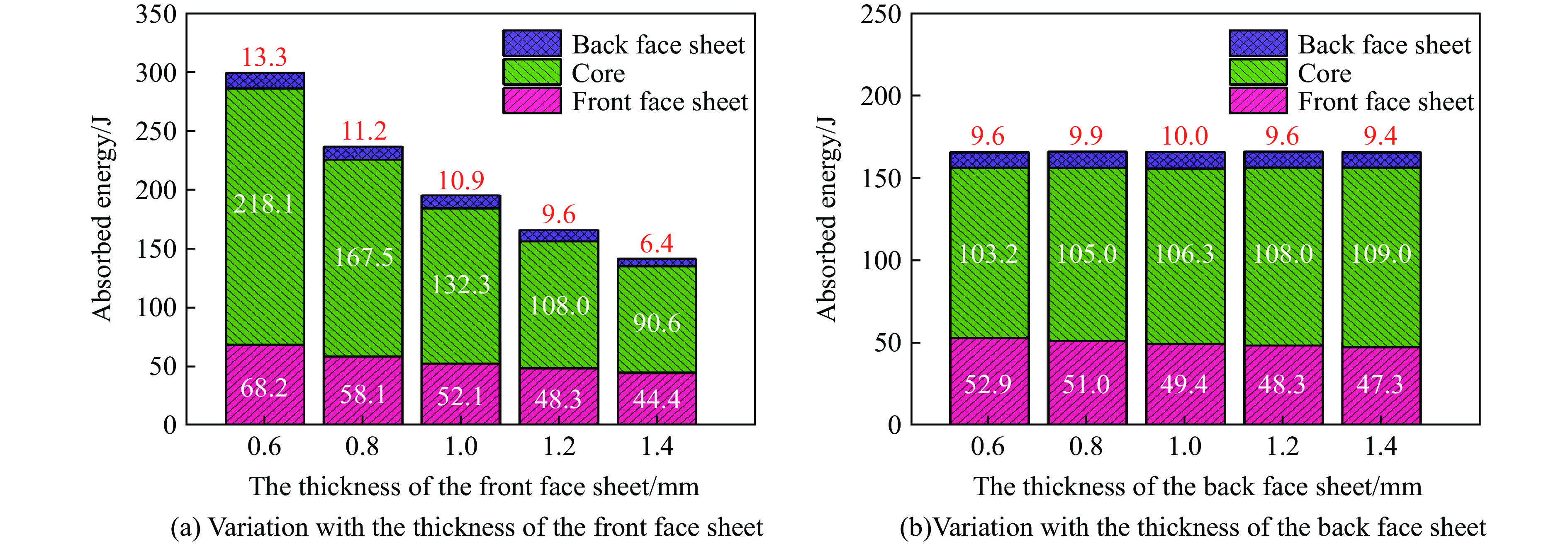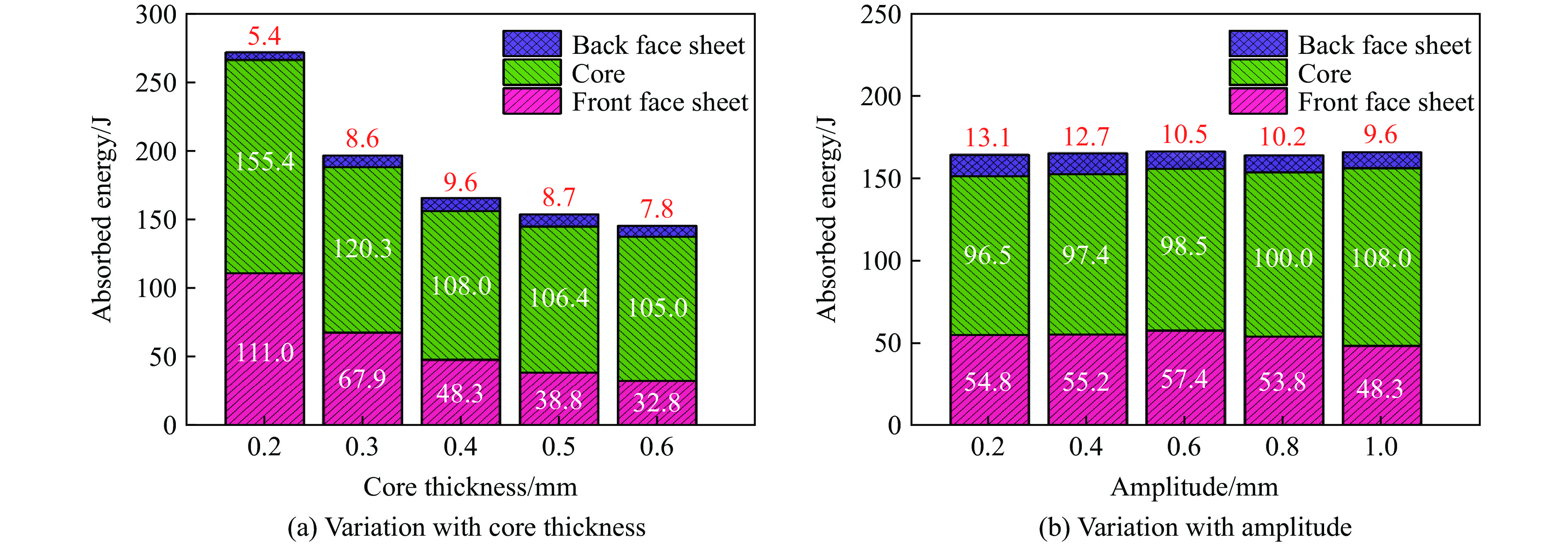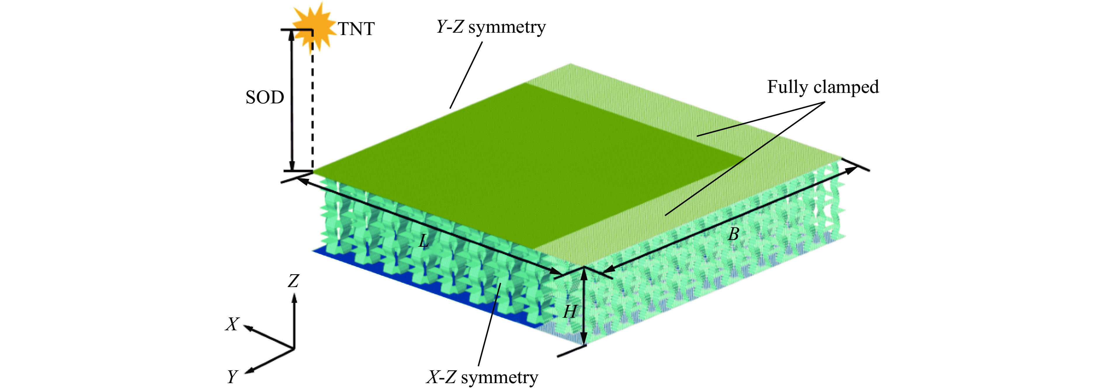 摘要: 具有优异能量吸收特性的负泊松比结构在抗爆炸冲击防护领域有广阔的应用前景。为进一步提升夹芯板的抗爆性能,提出了一种在X、Y方向力学特性相同的正弦曲边三维负泊松比夹芯板用于防爆保护。采用数值模拟方法,对夹芯板在空爆载荷下的动态响应和吸能特性进行了研究,分析了夹芯板塑性拉伸和弯曲对背面板变形模式和轴向偏转分布的影响,并探究了爆炸距离、炸药质量、面板厚度和芯层关键结构参数对夹芯板变形和能量吸收的影响。结果表明,在空爆载荷下,夹芯板的动态响应过程可分为芯层压缩、整体变形和自由振动3个阶段。后面板在纵向(X方向)和横向(Y方向)上的抗变形能力无明显差异。随着炸药质量增加和爆炸距离减小,夹芯板的后面板中心位移增加,芯层吸能占比减小。此外,采用薄前面板和厚后面板的夹芯板可以提高芯层的吸能占比。当分别增加相同的前、后面板厚度时,前面板厚度对减小后面板中心位移的影响更显著。当芯层厚度从0.6 mm减小至0.2 mm时,后面板中心位移减小49.0%,总能量吸收增加86.7%;芯层振幅从0.2 mm增大至1.0 mm时,后面板中心位移减小20.7%,总能量吸收大致不变;芯层高度从10 mm增大至18 mm时,后面板中心位移减小88.3%,总能量吸收增加56.9%;芯层宽长比从0.56减小至0.2时,后面板中心位移减小39%,总能量吸收增加47.4%。Abstract: The remarkable energy absorption properties of the negative Poissonʼs ratio structure offer extensive prospects for applications in blast protection. However, the existing in-plane configurations of two-dimensional auxetic honeycomb cores always represent anisotropic behavior. To further enhance the blast resistance of sandwich panels, a three-dimensional sinusoidal curved-edge sandwich panel with a negative Poissonʼs ratio effect in both the X and Y directions for blast protection was proposed. The dynamic response and energy absorption characteristics under air blast load were studied by numerical simulation. Deformation modes and axial deflection distribution caused by plastic stretching and bending of the back face sheet were investigated in detail. The effects of stand-off distance (SOD), explosive mass, panel thickness, and key geometric parameters of the core layer on deformation and energy absorption were discussed. The results show that the dynamic response process of the sandwich panel can be divided into three stages: core compression, overall deformation, and free vibration. Moreover, it is found that there is no significant difference in the ability to resist deformation of the sandwich structure along the longitudinal (X) and transverse (Y) directions. As the TNT mass increases and the SOD decreases, the central displacement of the back face sheet of the sandwich panel increases, leading to a decrease in the energy absorption ratio of the core layer. Furthermore, utilizing a sandwich panel with a thin front panel and a thick back panel can increase the energy absorption proportion of the core layer. When increasing the thickness of the front and back panels by the same amount, the thickness of the front panel has a more significant effect on reducing the center displacement of the back panel. When the core thickness decreases from 0.6 mm to 0.2 mm, the back panel center displacement decreases by 49.0%, and the total energy absorption increases by 86.7%. As the core amplitude increases from 0.2mm to 1.0mm, the back panel center displacement decreases by 20.7%, with the total energy absorption remaining roughly constant. With an increase in core height from 10mm to 18mm, the back panel center displacement decreases by 88.3%, and the total energy absorption increases by 56.9%. Furthermore, a decrease in core aspect ratio from 0.56 to 0.2 results in a 39% reduction in back panel center displacement and a 47.4% increase in total energy absorption. The results of this study can guide the design of energy-absorbing protection for sandwich panels.
