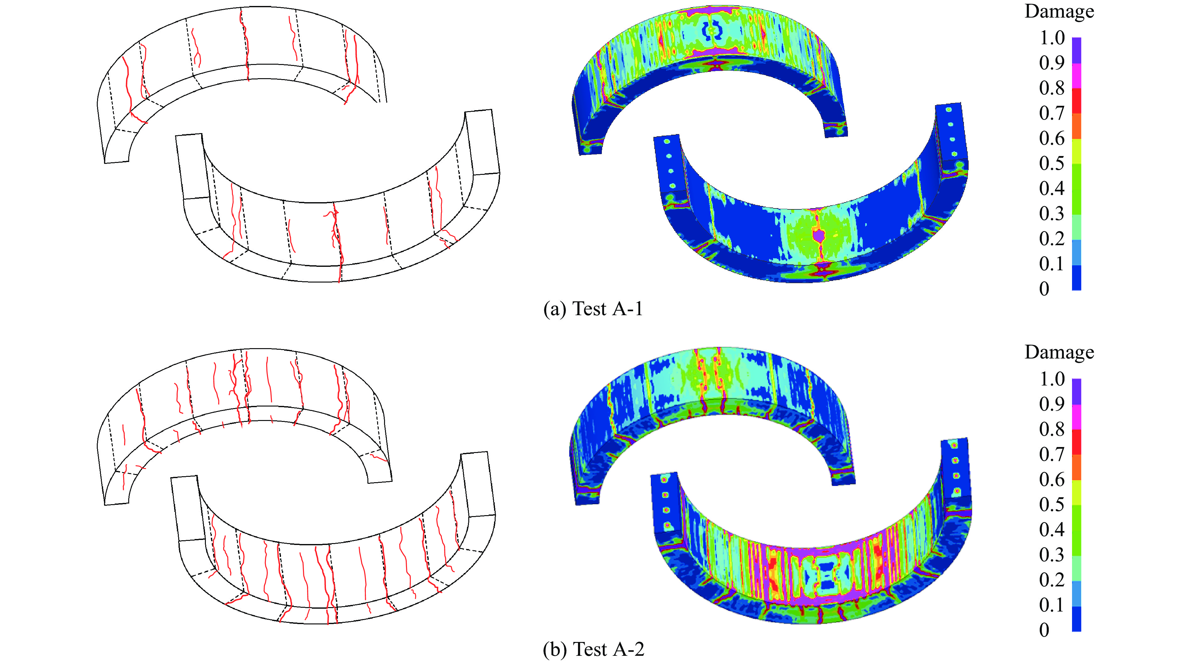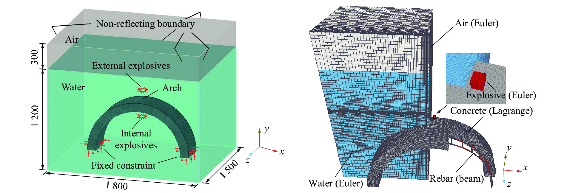 摘要: 为探究水下爆炸荷载作用下钢筋混凝土拱的动力响应特性和破坏特征,制作了两个钢筋混凝土拱试件,并开展了水下爆炸试验。试验分为拱外爆炸和拱内爆炸两组,采用10 g乳化炸药,试验时爆源距结构面最小距离为10 cm(起爆点位于拱结构正上方和正下方),通过传感器记录爆炸试验中钢筋混凝土拱典型断面处的水压力及加速度时程曲线。基于Arbitrary Lagrange-Euler (ALE)算法,建立了空气-水-炸药-钢筋混凝土拱等多介质动态耦合作用模型,将数值模拟结果与试验结果对比,验证了数值方法的可靠性。采用验证后的数值模型进一步研究了拱外及拱内爆炸荷载作用下钢筋混凝土拱的动力响应差异。结果表明:相同炸药当量下,内部爆炸有更多的能量作用于混凝土拱,使结构的动力响应更强烈;外部爆炸下,拱顶、拱腰处产生较大裂缝;内部爆炸时,迎爆面裂缝数量明显增多,拱肩位置出现裂缝。钢筋混凝土拱形结构抵抗外部爆炸荷载的能力明显强于内部爆炸荷载。Abstract: As common structures in hydraulic engineering, the arch structures may suffer from explosion load during their operation life. In order to explore the dynamic response characteristics and failure features of reinforced concrete arches subjected to underwater explosions, two reinforced concrete arch specimens were fabricated and underwater explosion tests were carried out. The tests consisted of two groups: external explosion and internal explosion. 10 g emulsion explosives were used, and the minimum distance between the explosion source and the structure was 10 cm (the explosives were placed directly above or below the arch). The time history curves of water pressure and structural acceleration at typical sections of the arches during the explosion tests were recorded. Based on the Arbitrary Lagrange-Euler (ALE) algorithm, a multi-material dynamic coupling model, including air, water, explosive, and reinforced concrete arch was established. The initiation of explosive, the propagation of shock wave, the interaction between fluid and solid, and the dynamic response of the structure were considered in the numerical model. The reliability of the numerical model was verified by comparing the numerical results and the experimental results. With the calibrated numerical model, the difference of dynamic response of reinforced concrete arches under external explosion and internal explosion was further studied. The results show that more energy acts on the concrete arch, and the structural response is stronger when subjected to internal explosion. Large cracks occur at the vault and waist induced by external explosion. Compared with the external explosion, the number of cracks significantly increases under internal explosion, and cracks also appear at the spandrel. The ability of reinforced concrete arch to resist external explosive loads is significantly stronger than that of internal explosive loads although the explosive weight is the same. For concrete arches that are vulnerable to external explosions, high strength concrete or reinforced reinforcement can be appropriately used in the arch vault and waist. For concrete arches that may be subjected to internal explosions, protective nets can be set to make the explosion occur at a longer distance away from the structures, or high strength materials can be used to resist the overall deformation.