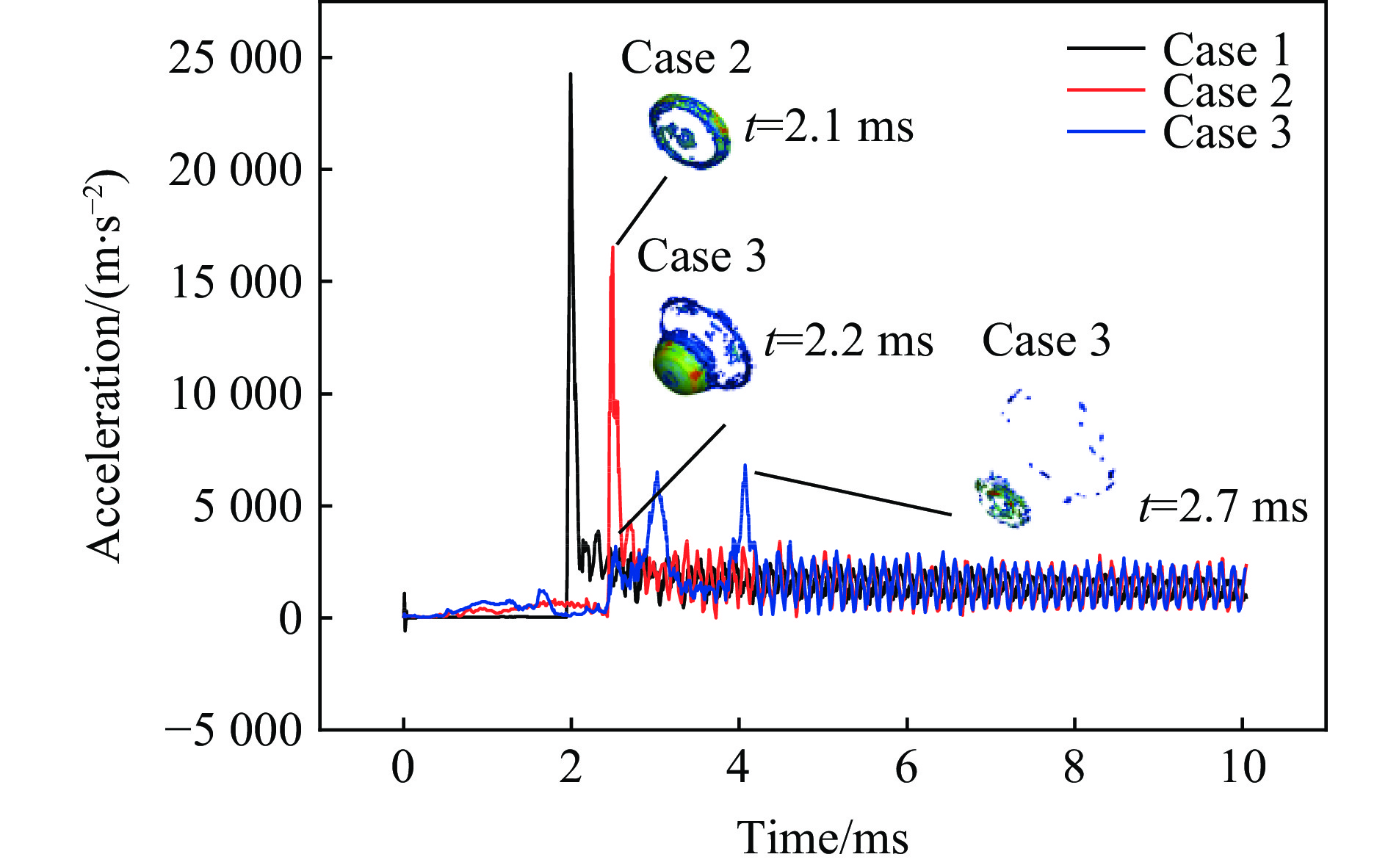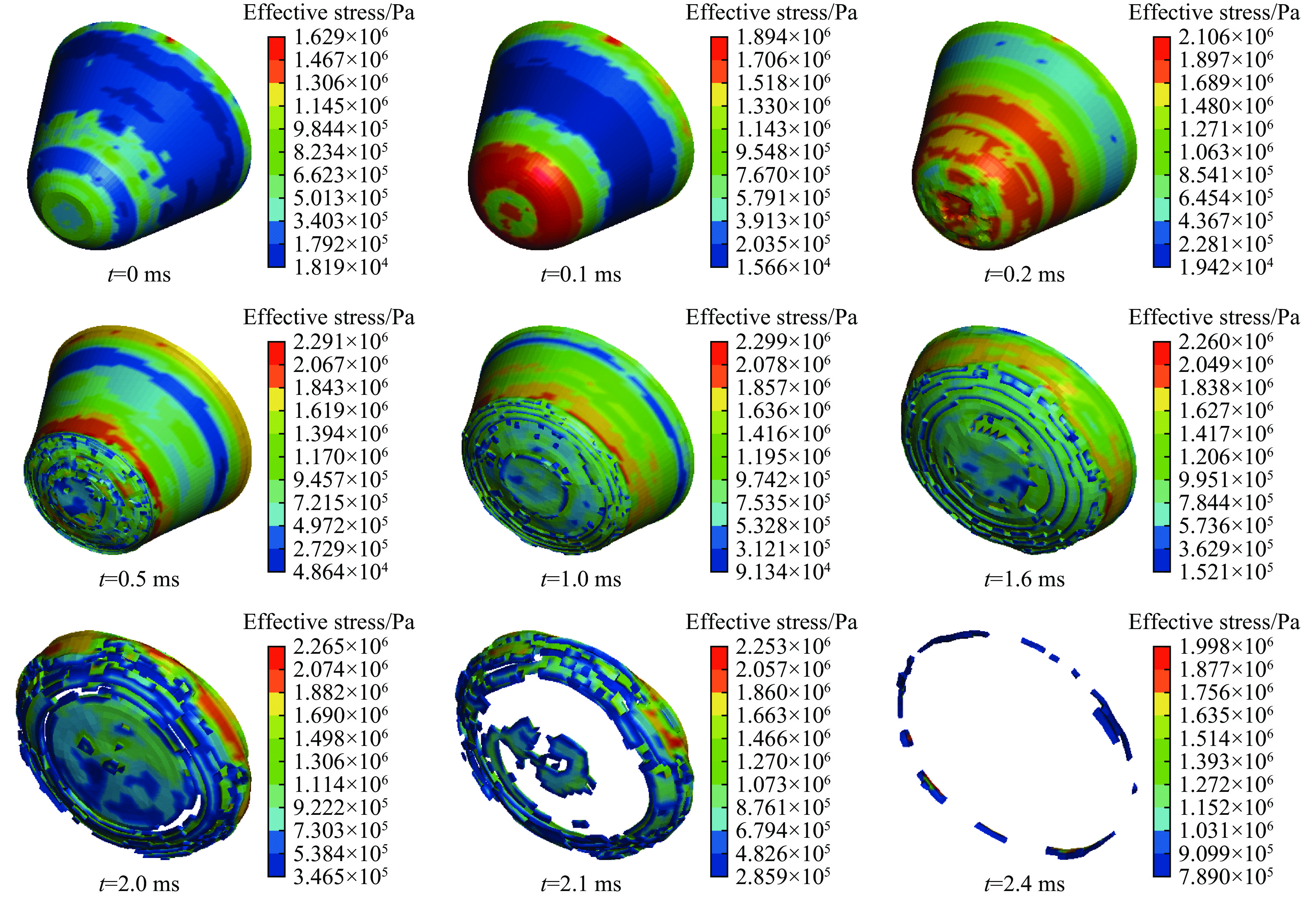 参数名称 符号 取值 参数名称 符号 取值 参数名称 符号 取值 损伤因子 D1 0.04 密度 ρr 2620 kg/m3剪切模量减小因子 ξ 0.50 损伤因子 D2 1.00 侵蚀塑性应变 $ {\varepsilon }_{\mathrm{s}}^{\mathrm{f}} $ 2.00 参考压缩应变率 $ {\dot{\varepsilon }}_{0}^{\mathrm{c}} $ 3.0×10−5 s−1 初始孔隙度 α0 1.00 抗压强度 fc 162 MPa 参考拉伸应变率 $ {\dot{\varepsilon }}_{0}^{\mathrm{t}} $ 3.0×10−6 s−1 失效面参数 A 2.48 压缩屈服面参数 $ {G}_{\mathrm{c}}^{\mathrm{*}} $ 0.50 破坏压缩应变率 $ {\dot{\varepsilon }}_{\mathrm{c}} $ 3.0×1025 s−1 失效面参数 N 0.79 拉伸屈服面参数 $ {G}_{\mathrm{t}}^{\mathrm{*}} $ 0.70 破坏拉伸应变率 $ {\dot{\varepsilon }}_{t} $ 3.0×1025 s−1 残余面参数 Af 1.62 洛德角相关因子 B 0.05 最小损伤残余应变 $ {\varepsilon }_{\mathrm{p}}^{\mathrm{m}} $ 0.012 残余面参数 Nf 0.62 洛德角相关因子 Q0 0.68 孔隙坍塌压力 pcrush 108 MPa 孔隙度指数 NP 3.00 压缩应变率指数 βc 0.008 孔隙压实压力 pcomp 6.00 GPa 状态方程参数 B0 1.22 拉伸应变率指数 βt 0.011 拉伸体积塑性应变分数 $ P_{\mathrm{t}}^{\mathrm{f}} $ 0.001 状态方程参数 B1 1.22 弹性剪切模量 G 21.9 GPa Hugoniot多项式系数 A1 33.95 GPa 相对抗剪强度 $ {F}_{\mathrm{s}}^{\mathrm{*}} $ 0.18 状态方程参数 T1 33.95 GPa Hugoniot多项式系数 A2 41.42 GPa 相对抗拉强度 $ {F}_{\mathrm{t}}^{\mathrm{*}} $ 0.06 状态方程参数 T2 0.00 GPa Hugoniot多项式系数 A3 8.71 GPa ρe/(kg·m−3) DJ/(m·s−1) PCJ/GPa $ {E}_{0}^{\mathrm{J}} $/(kJ·m−3) AJ/GPa BJ/GPa R1 R2 ωJ 1320 6690 16.0 7.38×106 586 21.6 5.81 1.77 0.282 表 3 空气模型材料参数