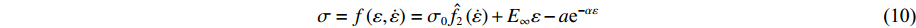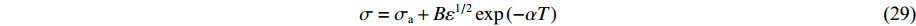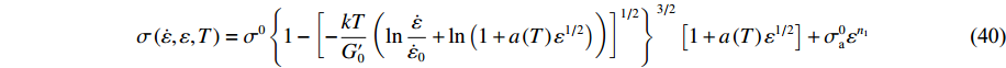 对于BCC:$\sigma = {\sigma _{\text{a}}} + {C_2}\exp \left\{ {\left[ { - {C''_3}T + {C'_4}T\ln \left( {\dfrac{{\dot \varepsilon }}{{r\left( \varepsilon \right)r\left( {\dot \varepsilon } \right)}}} \right)} \right]H\left( T \right)} \right\} + {C_5}{\varepsilon ^n}$Samantaray-Mandal[49] $\sigma = \left( {{C_1} + {C_2}{\varepsilon ^n}} \right)\exp \left[ { - \left( {{C_3} + {C_4}\varepsilon } \right){T^ * } + \left( {{C_5} + {C_6}{T^ * }} \right)\ln {{\dot \varepsilon }^ * }} \right]$ Abed-Voyiadjis[50] 对于FCC:$\sigma = {C_2}{\varepsilon ^{0.5}}\left( {1 - {X^{1/2}} - X + {X^{3/2}}} \right) + {C_6}$和$X = {C_4}T\ln \left( {1/{{\dot \varepsilon }^ * }} \right)$