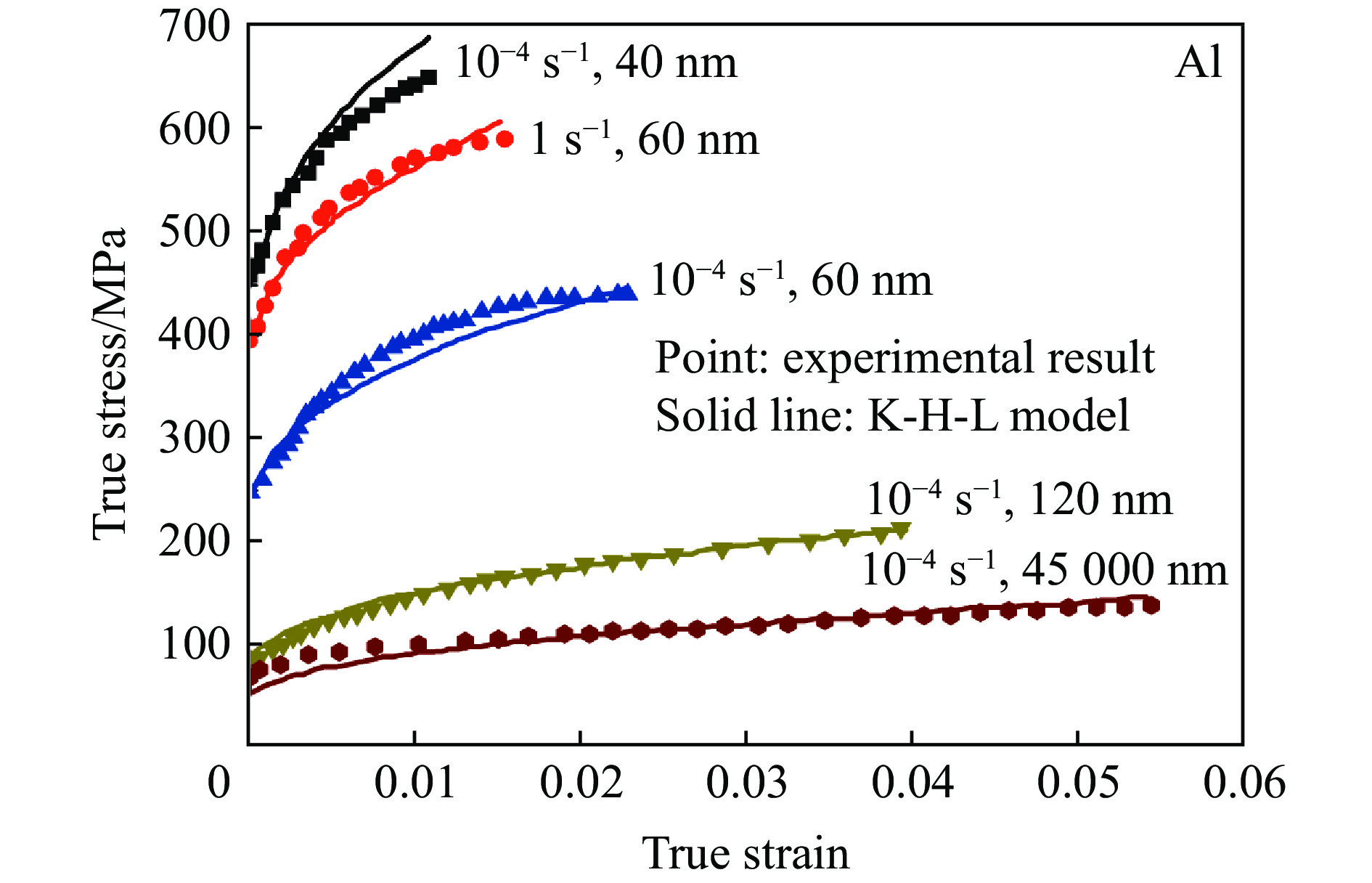 (2)基于热激活理论2009 Zhang-Wen[48] 10−5~10−2 考虑了温度、应变率和变形过程对Z-A模型中参数的影响 2009 Samantaray-Mandal[49] 10−3~1 考虑了温度与应变、温度与应变率的耦合效应对流动应力的影响 2005 Abed-Voyiadjis[50] 10−4~104 (1)可用于预测等温和绝热塑性变形的应力应变曲线