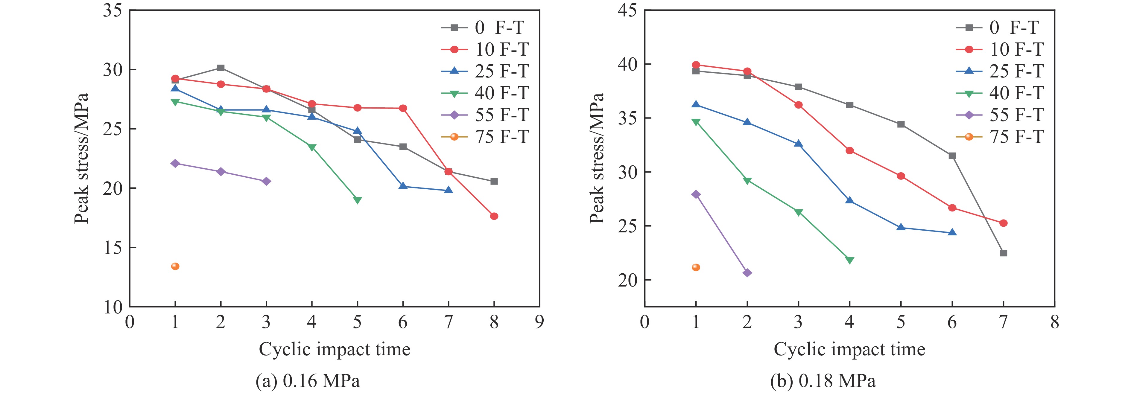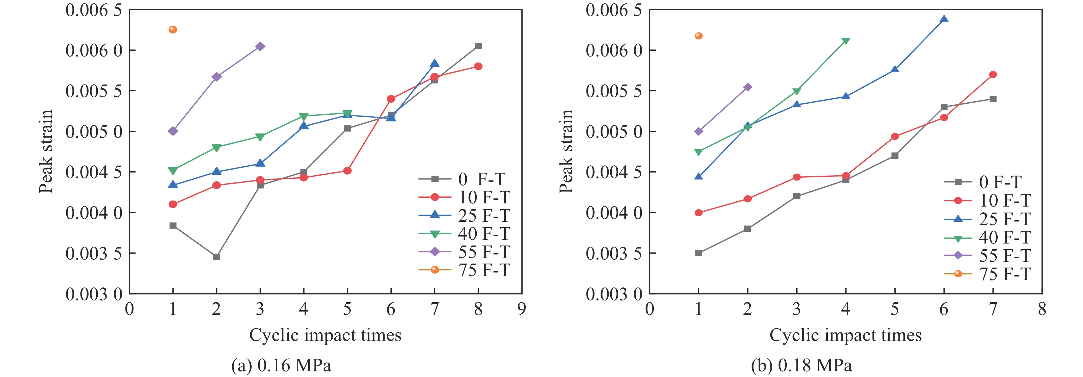 模量/GPa0 1 29.08 0.0038 11.13 25 1 28.36 0.0043 9.35 2 30.12 0.0035 12.48 2 26.63 0.0044 8.02 3 28.40 0.0042 9.35 3 26.58 0.0046 7.84 4 26.59 0.0045 8.01 4 25.97 0.0051 7.48 5 24.08 0.0050 7.60 5 24.78 0.0052 6.23 6 23.49 0.0052 6.53 6 20.13 0.0052 5.73 7 21.39 0.0056 5.14 7 19.79 0.0058 3.39 8 20.56 0.0061 4.48 40 1 27.30 0.0045 8.49 10 1 29.24 0.0041 10.25 2 26.46 0.0048 8.01 2 28.76 0.0043 9.36 3 25.90 0.0049 7.48 3 28.36 0.0044 7.84 4 23.52 0.0052 6.54 4 27.11 0.0044 7.45 5 19.04 0.0054 4.98 5 26.76 0.0045 6.76 55 1 22.08 0.0051 6.06 6 26.73 0.0054 5.36 2 21.38 0.0057 5.12 7 21.39 0.0056 5.13 3 20.52 0.0060 4.48 8 17.64 0.0058 3.56 75 1 13.41 0.0063 4.98 表 3 冲击气压为0.18 MPa时红砂岩试样的动态峰值应力、峰值应变和变形模量
