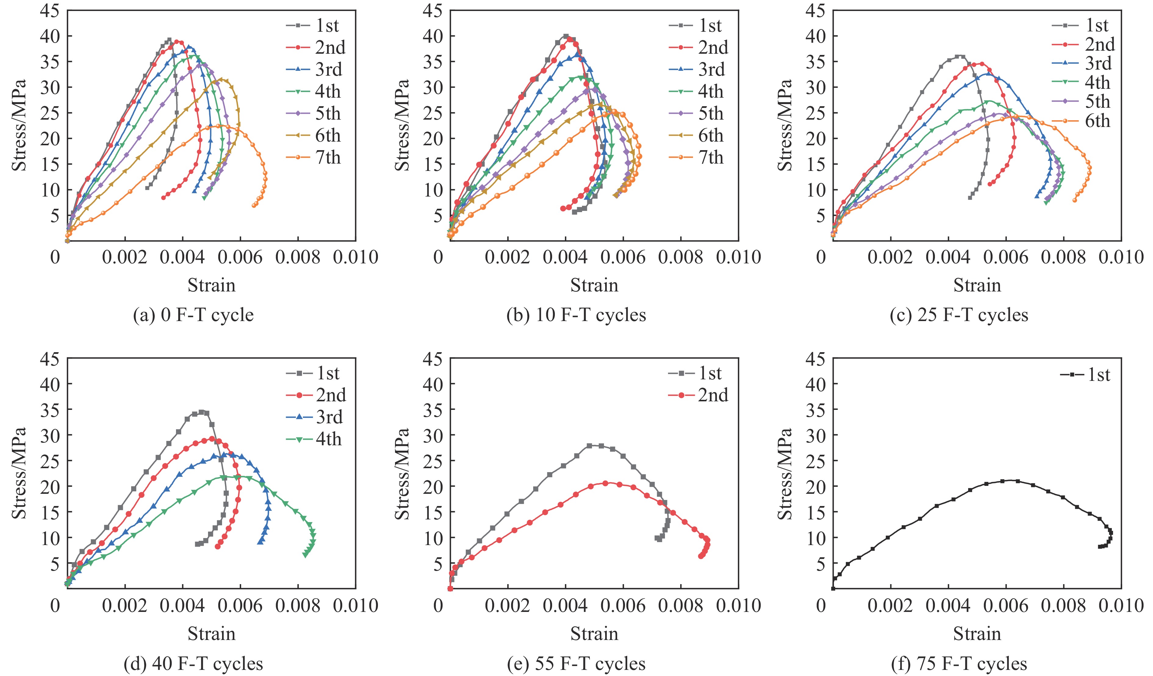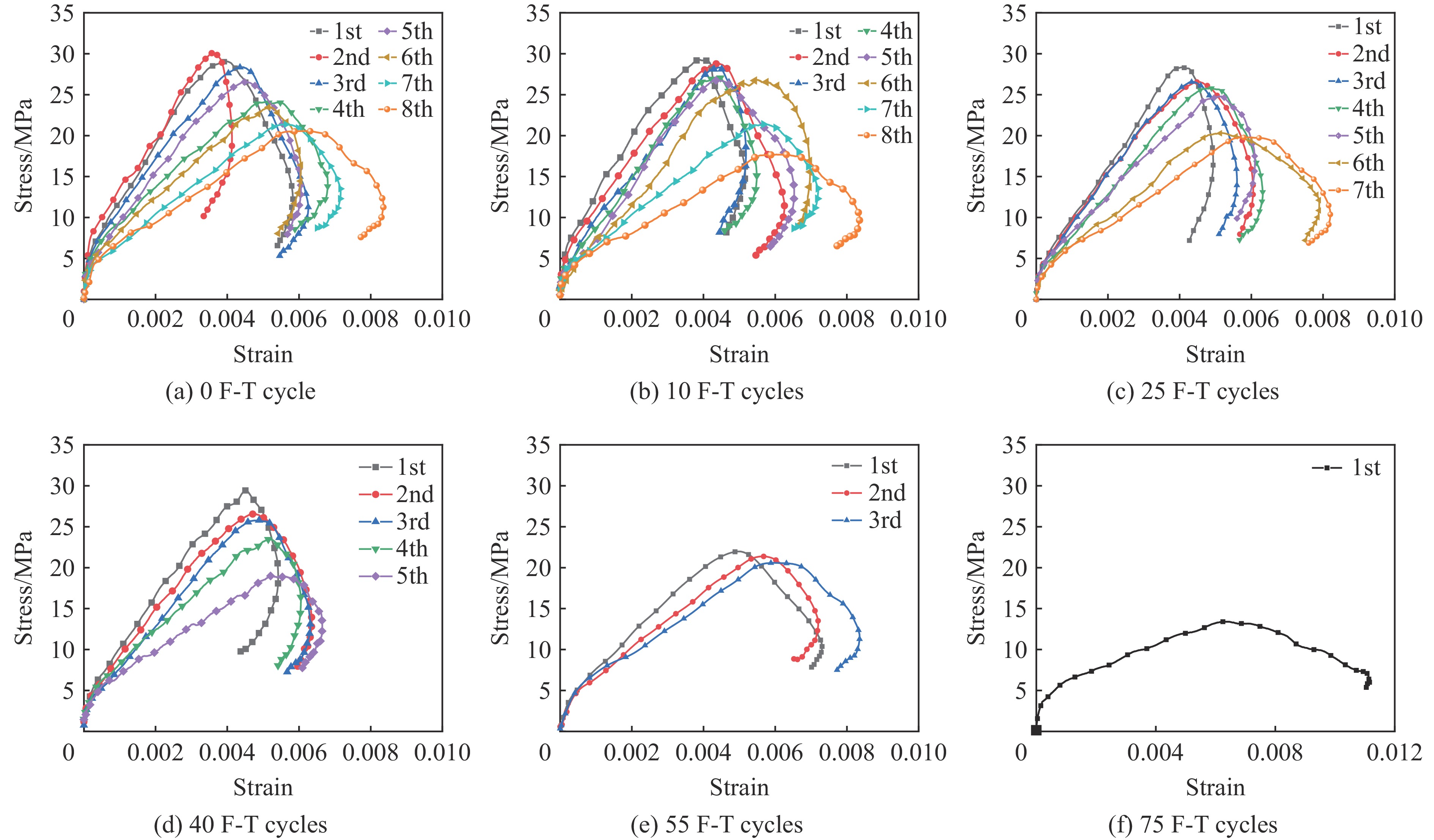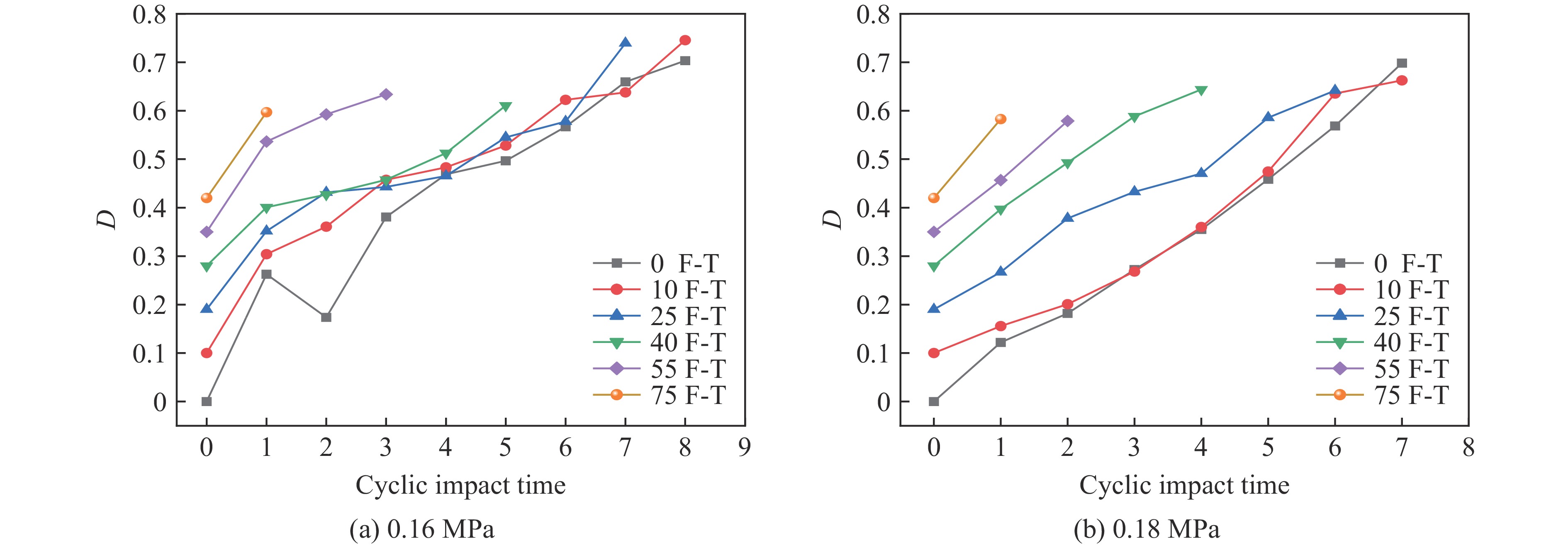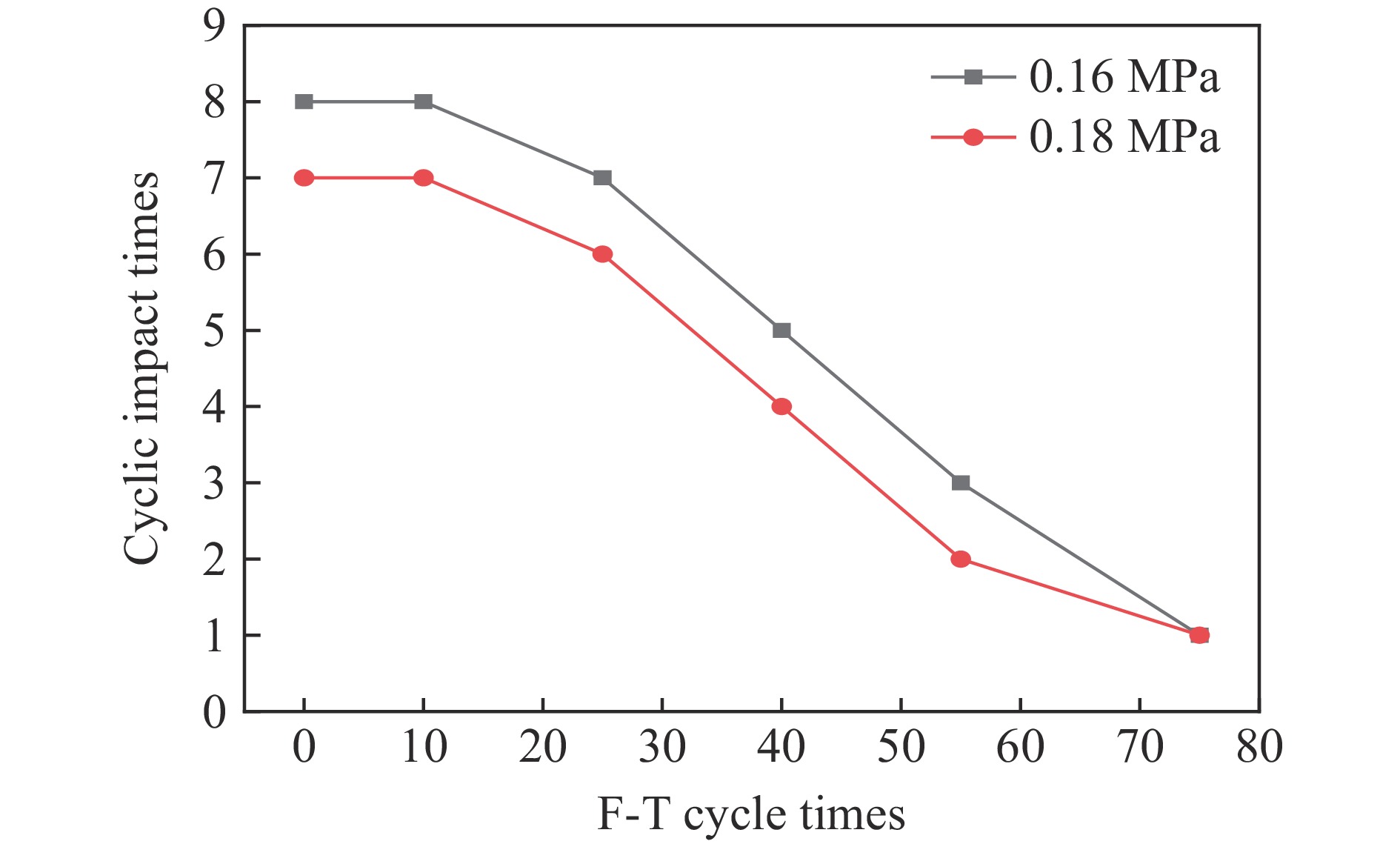摘要: 为探索循环动力扰动作用下冻融岩体的强度和变形特性及损伤机理,开展了两种冲击气压下冻融红砂岩的循环冲击试验,研究了循环冲击次数和冻融次数对应力波传播、动态应力-应变曲线、峰值应力和峰值应变的影响规律;基于Lemaitre应变等效原理,提出了能够综合考虑循环冲击和冻融影响的累积损伤因子的计算方法,分析了冻融和循环冲击作用后红砂岩的微观结构特征。结果表明:循环冲击荷载下不同冻融次数处理后的红砂岩试样均呈拉伸破坏模式;红砂岩试样可承受的循环冲击次数与冻融次数呈负相关,冻融75次后试样在首次冲击后即达到破坏状态;循环冲击次数主要影响透射波的起跳点、峰值点对应的横坐标和振幅以及反射波的振幅,而冻融循环次数对第一次冲击时透射波的起跳点、峰值点对应的横坐标和振幅影响较大;红砂岩试样累积损伤因子与动态峰值应力呈现较好的负相关变化规律;冻融和循环冲击复合作用后红砂岩内部裂纹沿颗粒边界扩展且与孔洞连接形成较为复杂的网络。
