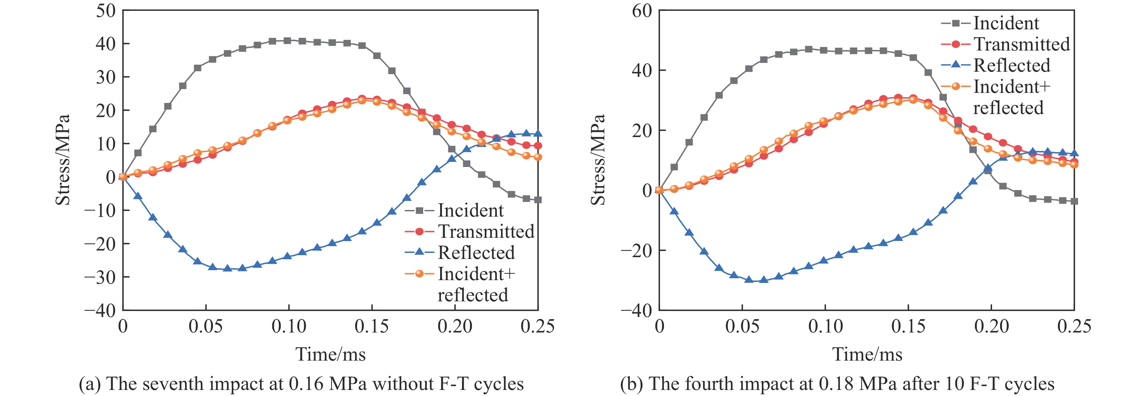Table 2. Dynamic peak stresses, peak strains, and deformation moduli of red sandstone specimens at the impact gas pressure of 0.16 MPa