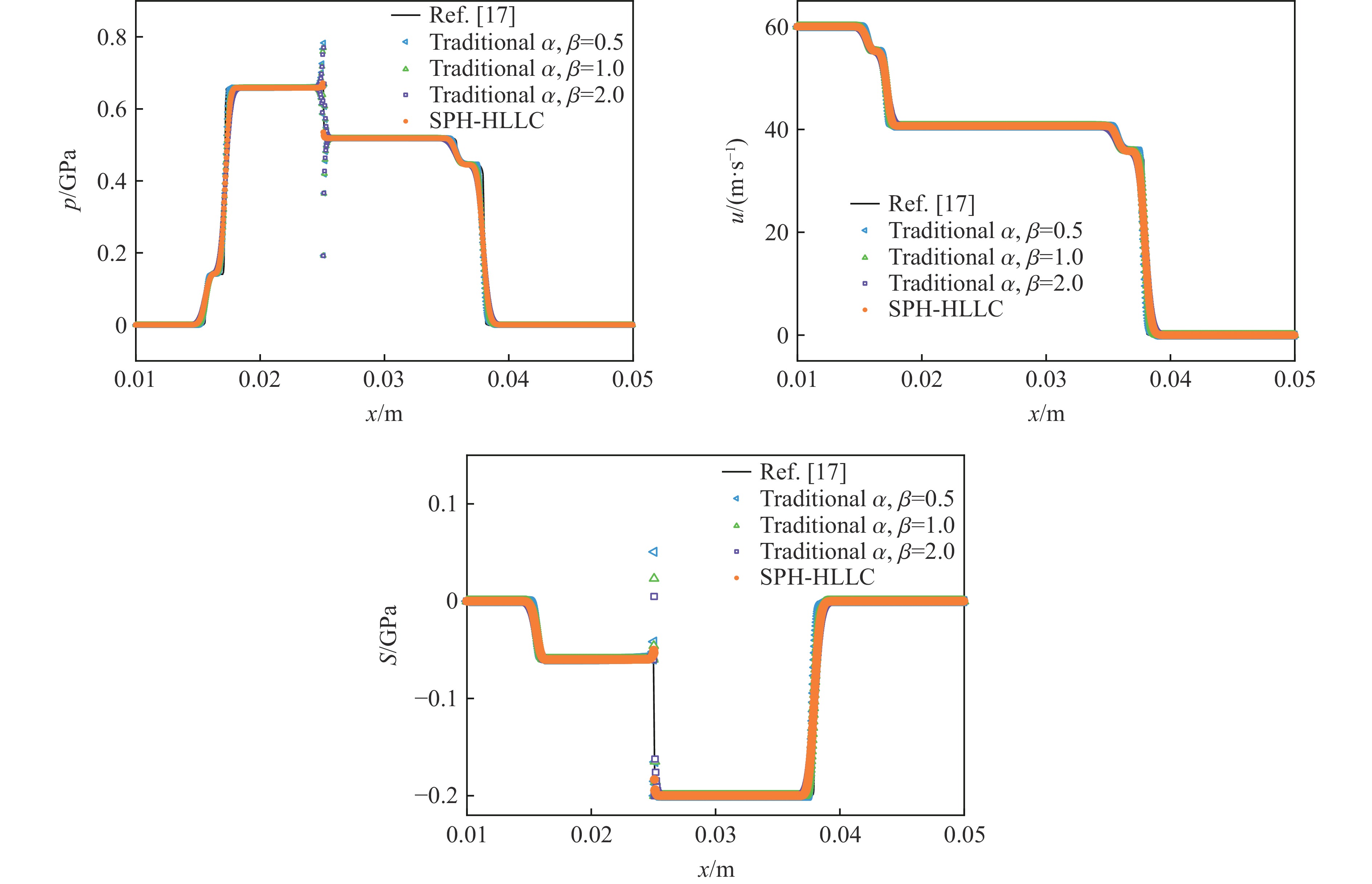 算例 ρ/(kg·m−3) u/(m·s−1) Y0/MPa μ/GPa a0/(m·s−1) ρ0/(kg·m−3) s Γ0 坐标区间/mm t/μs Wilkins 左侧 2785 800 300 27.6 5328 2785 1.338 2 0 ~ 5 5 右侧 2785 0 300 27.6 5328 2785 1.338 2 5 ~ 50 表 3 铜铝材料撞击算例的相关参数